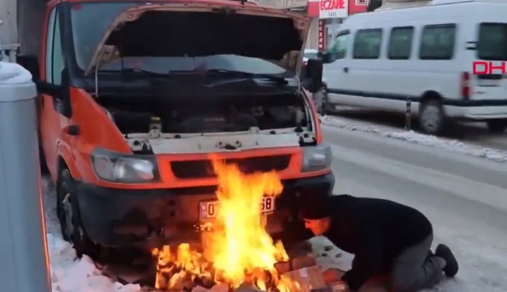Az alábbi videón látható Ford Transit dízelmotorja a farkasordító hidegben megmakacsolta magát, és nem indult be a slusszkulcs egyszerű elfordítására. A török sofőr ettől egyáltalán nem jött zavarba és gyorsan alágyújtott egy kicsit a kocsinak – írja a hvg.hu.