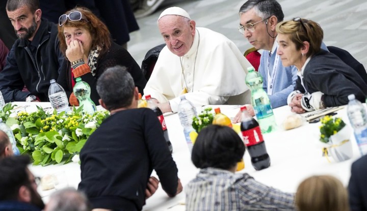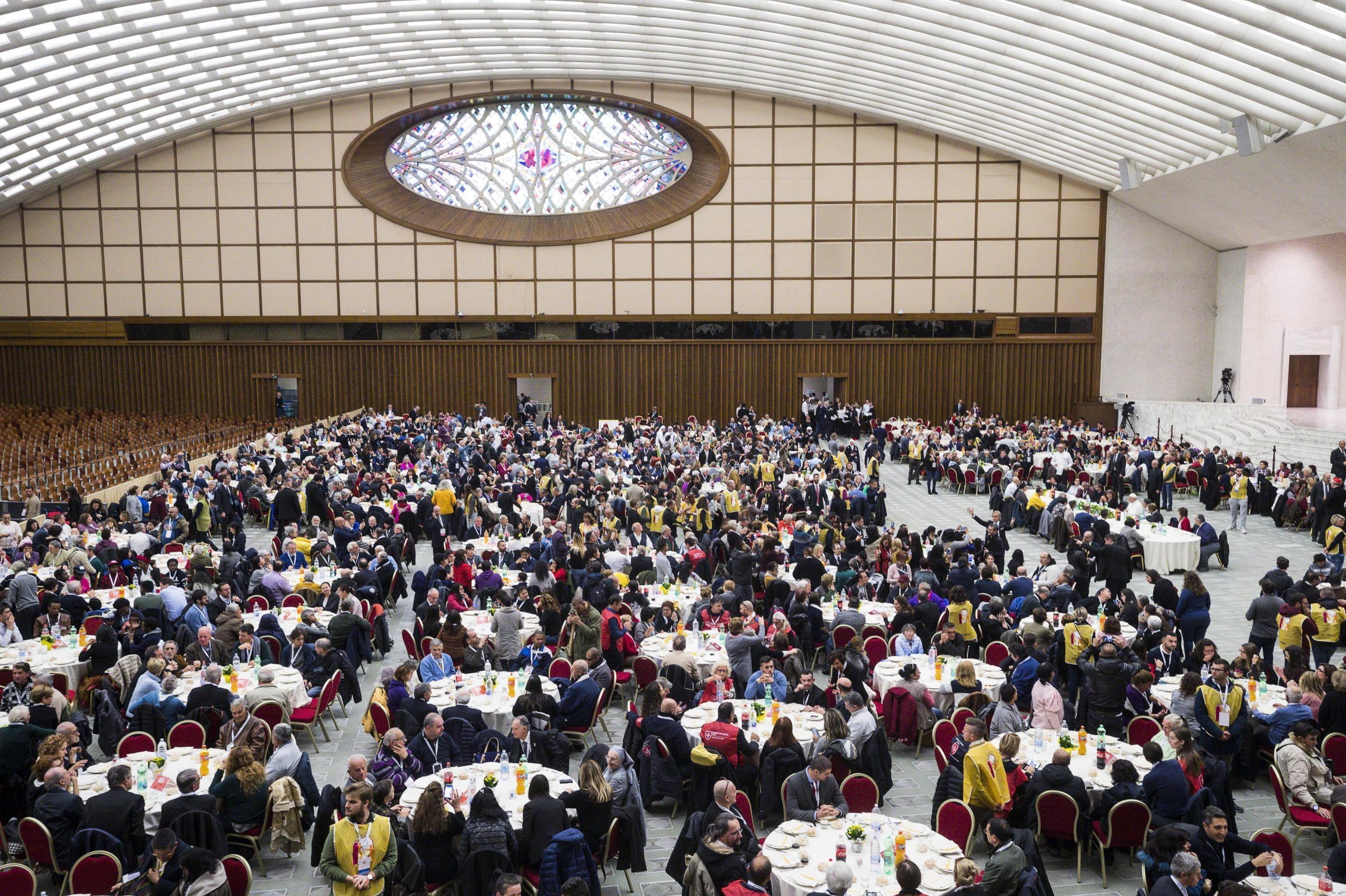 A mise után háromezren vettek részt a vatikáni VI. Pál audienciateremben rendezett közös ebéden, amelyet az egyik római luxus szálloda és szociális alapítványok ajánlottak fel. Százan egy asztalnál ültek Ferenc pápával. A római és más olasz plébániákon is ebéddel várták a környék szegényeit.