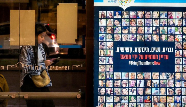 Címlapkép: A Hamász túszainak fotói egy izraeli buszmegállóban (AFP)