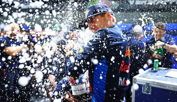 Címlapkép: Max Verstappent pezsgővel locsolják társai a világbajnoki cím elnyerése után Las Vegasban (Fotó: AFP)
