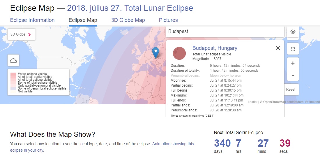 Érdemes megadni az aktuális tartózkodási helyünket a Time and date oldalán, ahol a rendszer megmondja, mikor kell felnézni az égre, hogy ne maradjunk le az égi tüneményről. Ha például Budapestre keresünk rá kiderül, hogy a Hold 20:15-kor kel fel, kilenc perccel később pedig belép a Föld árnyékába, és elkezdődik a részleges holdfogyatkozás. A Hold 21:30-kor tűnik majd el teljesen, és 23:13-kor bukkan fel újra, majd 00:19-kor véget ér a jelenség.