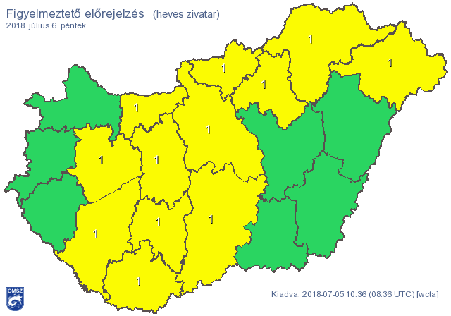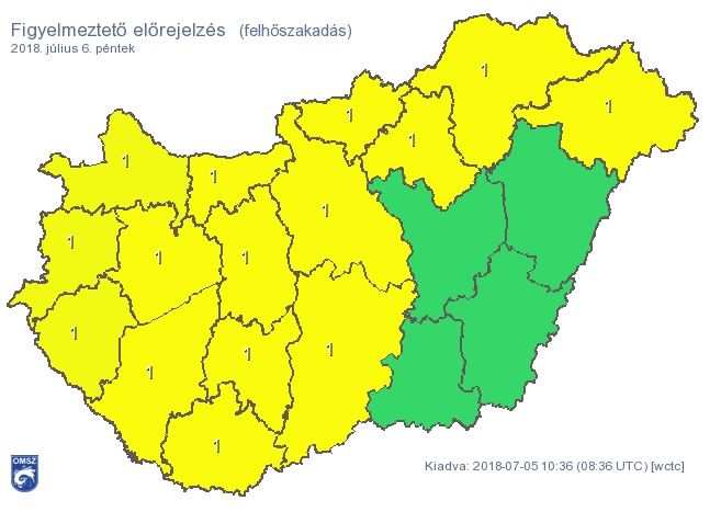 Éjszaka inkább a Dunántúlon lesznek záporok, zivatarok, pénteken viszont már országszerte. A zivatarokhoz felhőszakadás, nagyobb méretű jég és viharos széllökés társulhat, a heves zivatarok miatt az Országos Meteorológiai Szolgálat 12 megyére adott ki elsőfokú figyelmeztetést, míg a felhőszakadás miatt 15 megyére.