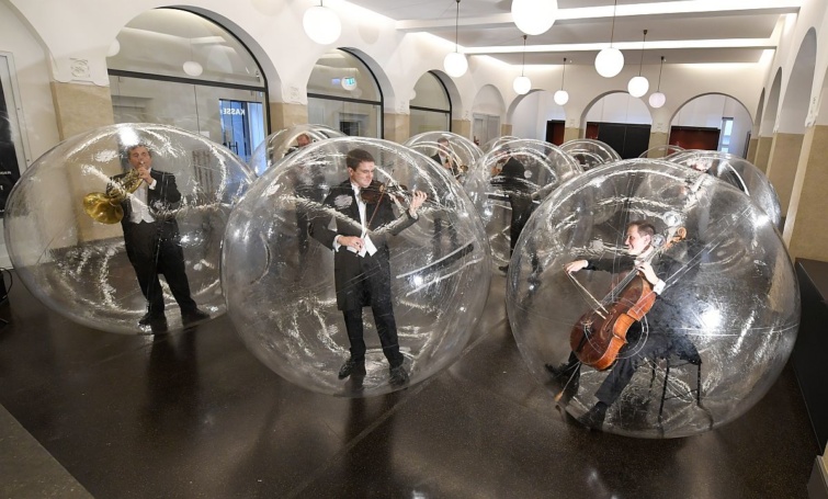 Tetőtől talpig elegánsan felöltözve és óriási, áttetsző buborékokba bújva zenéltek a Stuttgarti Filharmonikus Zenekar tagjai egy művészeti projekt részeként.