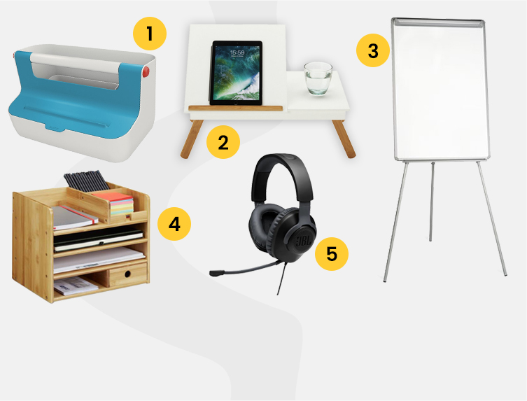 Maradva a laptopasztaloknál (2), a fentivel is jól lehet dolgozni ágyon, kanapén vagy fotelben, és a tanuláshoz is nagyszerű. Az asztallap maga többféle szögbe beállítható, így komfortos használatot biztosít. Egy másik asztali iratrendszerezőt (4) is mutatunk bambuszból, kicsit más elrendezéssel, fiókkal, írószertartóval. És ha már írószertartó, akkor több színben is elérhető a Leitz hordozható rendszerezője (1), amibe beleférnek egy iroda legfontosabb kellékei. A belsejében található apróbb rendszerezőkben mindennek van helye az írószerektől, a tűzőgépig, ám egy kávéval megtöltött thermobögre tárolására is alkalmas. Felszínére telefont, táblagépet is rá lehet állítani, aminek a fogantyú ad megfelelő támaszt. Apropó fogantyú… Nem az az egyetlen előnye, hogy minden apróság belefér, hanem az is, hogy bárhova magával viheti a használója.