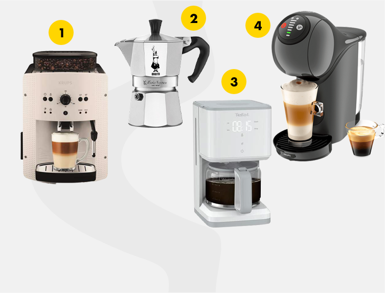 A kotyogós kávéfőző (2. kép) olcsó és klasszikus. A termék űrtartalma 150 ml. A filteres főző (3. kép) térfogata 1,25 lilter, rendelkezik digitális kijelző érintésvezérléssel, az AROMA funkció kétfázisú kávékészítést biztosít. Legyen szó cappuccinoról vagy eszpresszóról, a kapszulás kávéfőző (4. kép) pedig akár 30 másodperc alatt megcsinálja kedvenc kávédat.