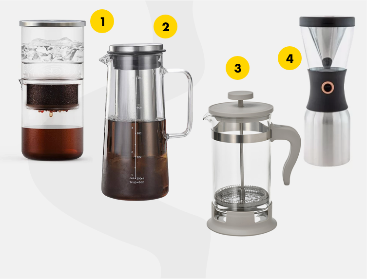 Hideg kávéhoz szintén nem szükséges drága gépekre és alkatrészekre költeni. A termékek közt keresgélve találhatsz egész olcsó kávékészítőket (2. kép és 3. kép), de kifejezetten professzionális szerkentyűket (1. kép és 4. kép) is.