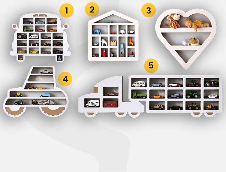 Ezekkel a különféle formájú polcokkal (a képen nem az összeset látod!) nemcsak feldobod a gyerkőc szobáját, de sokat segíthetsz vele az apró játékok elhelyezése okozta nehézségeken is. Pláne, ha kisautó-mániás fiúról van szó, de éppenséggel egy kislánynak is jól jöhet egy szív alakú polcocska, hogy elhelyezze rajta gyűrűit vagy karkötőit.