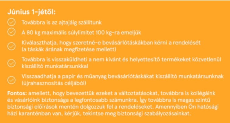 A rendeléseket bevásárlótáskában szállítják ki; arra kérik a vásárlót, hogy az átadásnál viseljen maszkot. A korlátozások a 2021. 06. 01-én vagy azt követően leadott rendelésekre érvényesek.