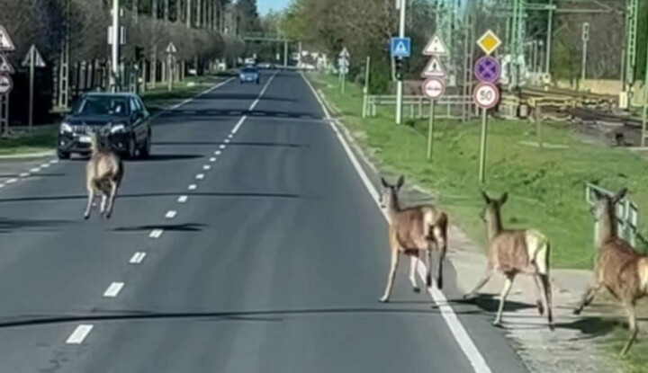 Balatonfenyves közelében, a 7-es főúton centiken múlt a tömegbaleset: egy fedélzeti kamera felvételén látszik, ahogy a vasút mellől hirtelen egy csapat szarvas vágtat az úttestre.