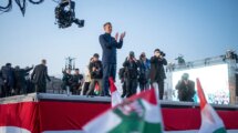 A Tisza Párt elnöke a Bécsi kapu téren tart beszédet az Út a győzelembe országjárás győri állomásán.