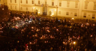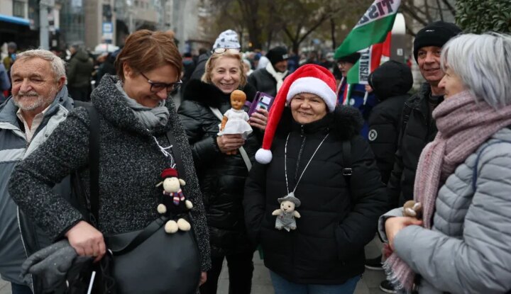 "Védjük meg a gyermekeinket" molinó mögött, plüssállatokkal vonul a tömeg a Karmelitához és a Sándor-palotához, ahol egy kupacba gyűjtik a játékokat.