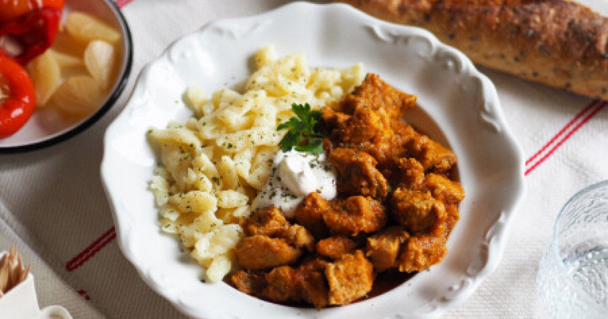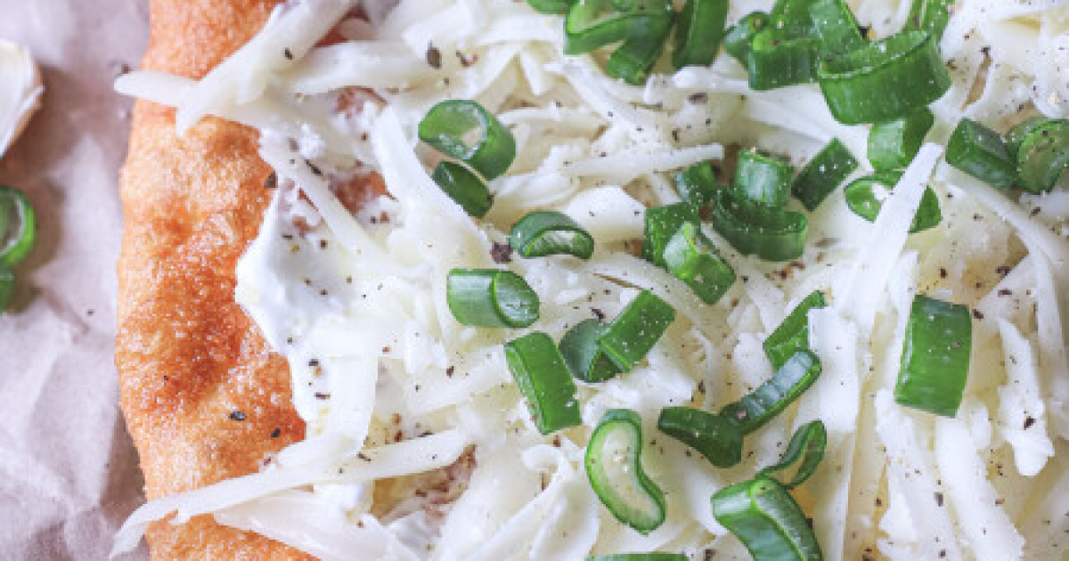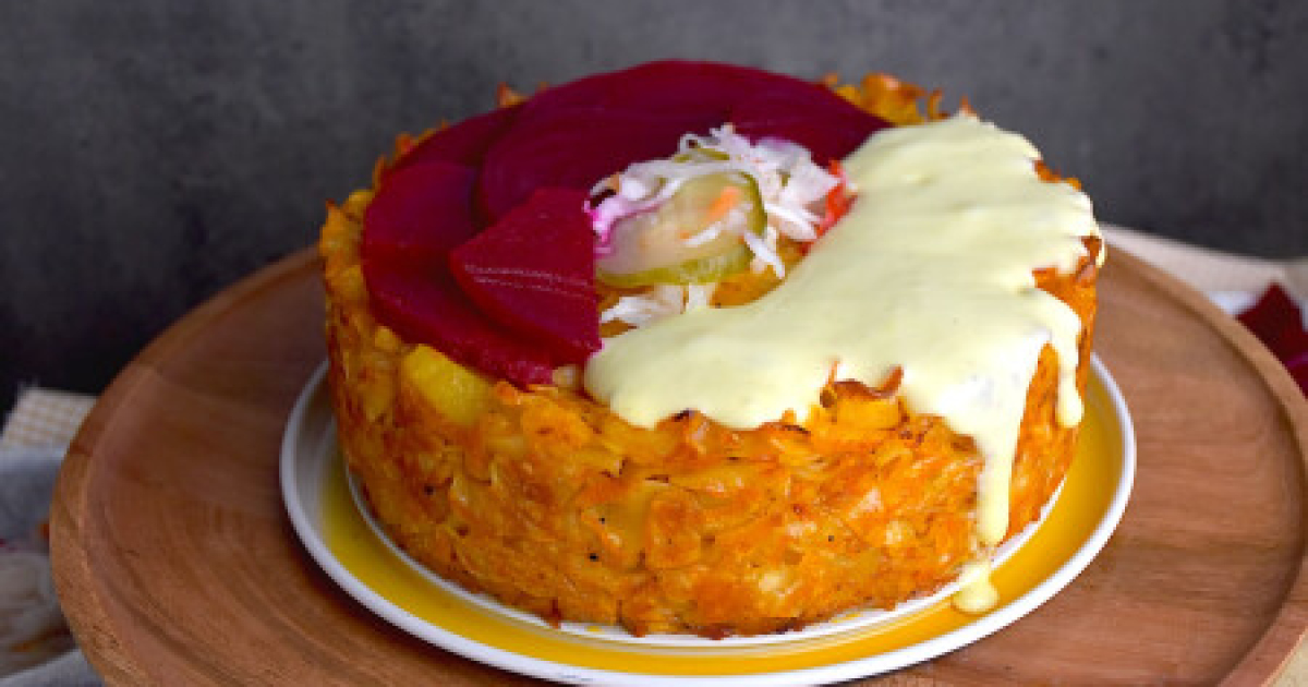 Krumplistészta-torta krumplipüréhabbal és savanyúsággal