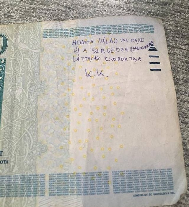 „Hogyha nálad van, rakd ki a Szegeden láttalak csoportba. K.K.” – írták hat évvel ezelőtt arra az ezer forintos bankjegyre, amelyet szándékosan hagytak el.