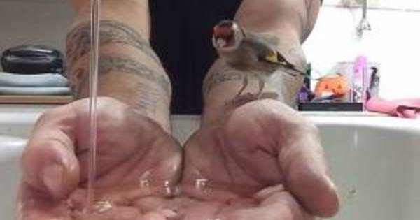 A csobogó viztől azonnal gazdája kezére repül a madárka