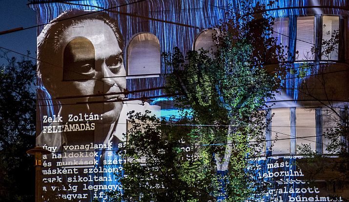 A címlapkép illusztráció (Fényfestés a Magyar Írószövetség fõvárosi székházának homlokzatán a költészet napja alkalmából 2017. április 11-én. MTI Fotó: Szigetváry Zsolt)