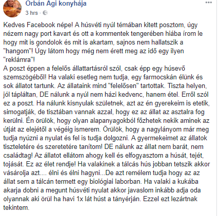Tegnap nagy port kavart Orbán Ágnes, a Konhyafőnök 3. évadának nyertesének egyik posztja, melyet hivatalos Facebook oldalán tett közzé. A szakács ebben felajánlotta, hogy azokat a nyuszikat, akikre az ünnep után már nem tartanak igényt a gazdáik, nyugodtan küldjék el neki feldolgozásra. A képet elmondása szerint eredetileg viccnek szánta, de úgy tűnik rajongói nem értették a tréfát és felháborodott nyúlbarátoktól haragos kommentek százait kapta. Köztük többen már odáig jutottak, hogy a gyerekeit is fenyegetik.