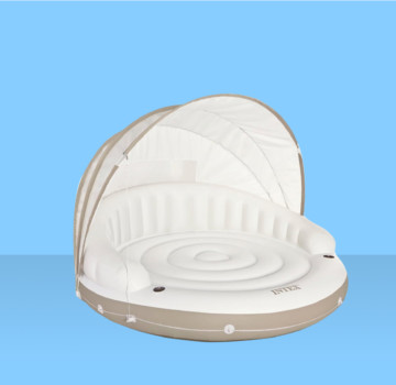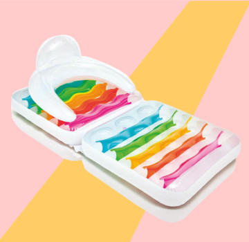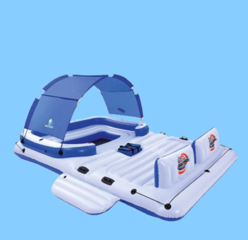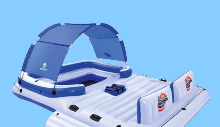 Végül a legprofibb szett: a napvédős medencelyukkal ellátott, külön pihenőteres úszósziget! Oldalt kapaszkodókkal, középen pedig hűtőtáskával. Nem túlzás azt mondani, hogy ezen a teljes család, vagy egy komplett baráti társaság is eltöltheti a napot. (Csak egy kicsit macerás, ha helyet akartok változtatni.)