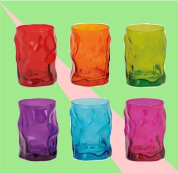 Következő kedvencünk az összegyűrt hatású pohár, ami első blikkre tényleg úgy tűnik, mintha összegyűrt műanyag lenne. Valójában azonban gyűröttre olvasztott üveg, ami már azelőtt mókás hangulatot kölcsönöz, hogy a tartalmába beleinnál. Egy vidám, sokemberes eseményen garantált sikert arat ez a poén – nem beszélve arról, hogy egy dobozban 17 darab van, és ezek is különféle színben pompáznak, hogy mindenki megjegyezhesse, melyik volt a sajátja.