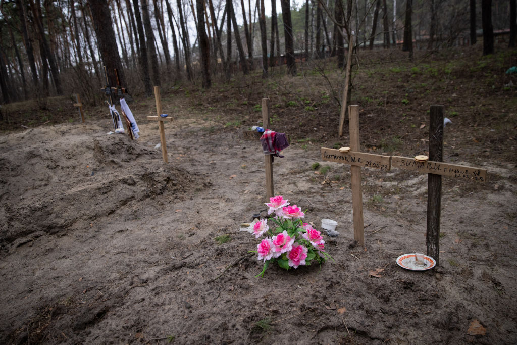 A területen civil ruhás holttestek százait találták meg az orosz katonák visszavonulása után, a nyomok alapján többeket megkötöztek és kivégeztek. A Kreml álhírnek minősítette a tömeges gyilkosságot. Bővebben.