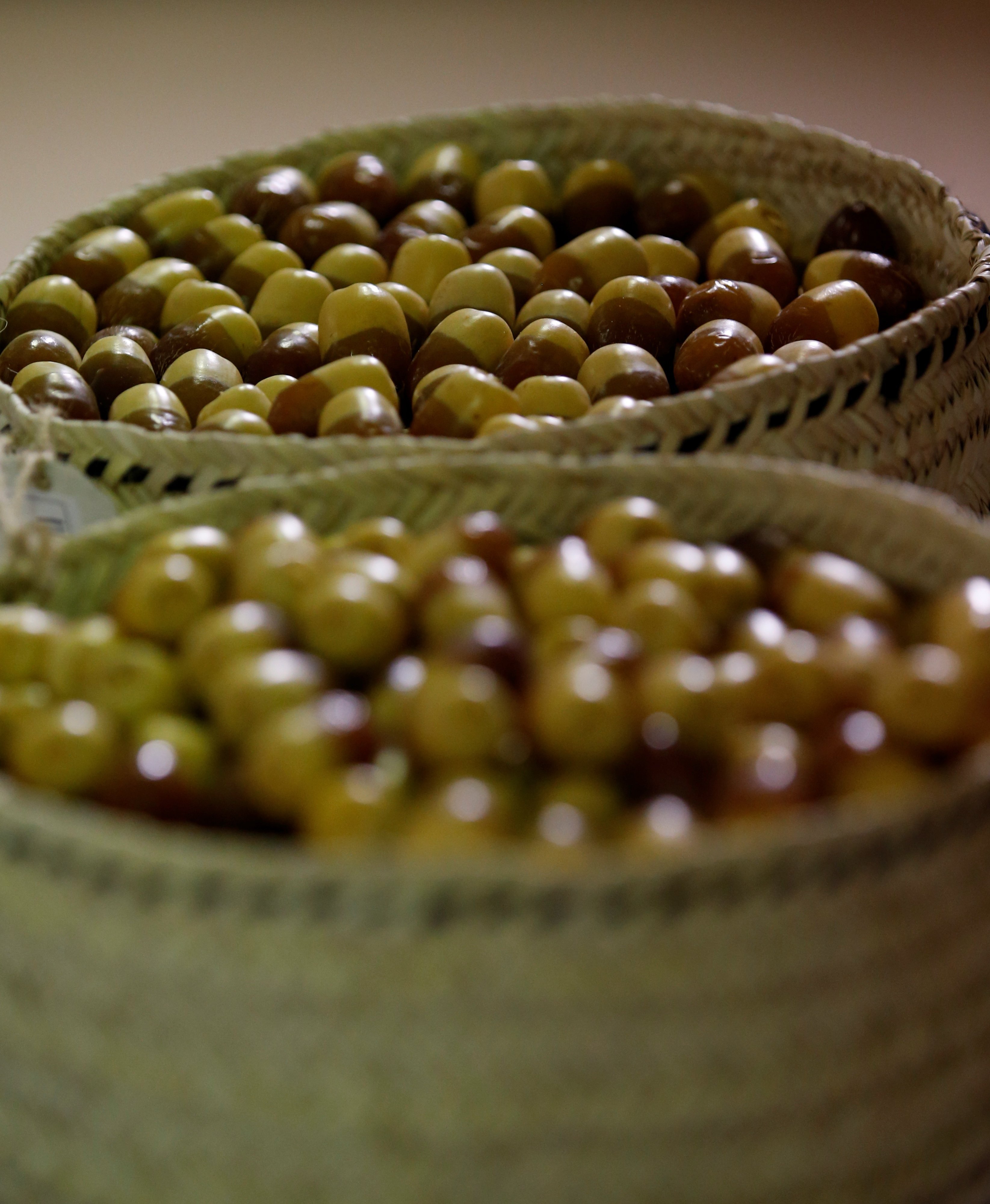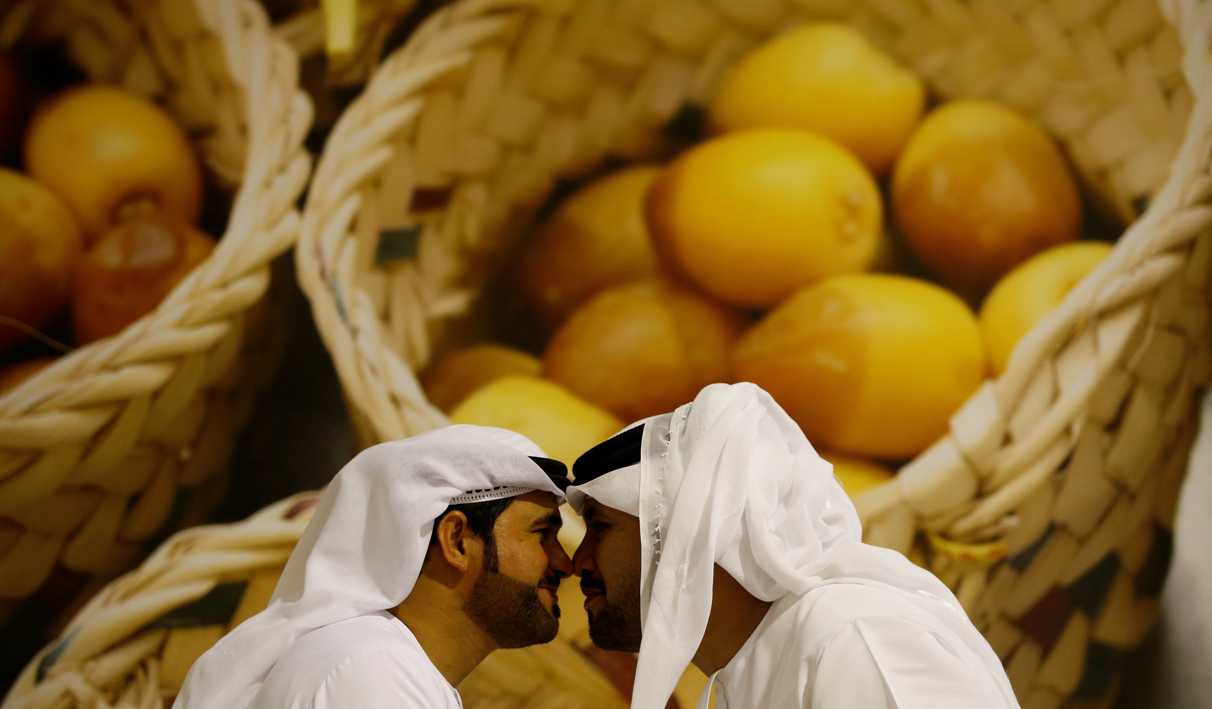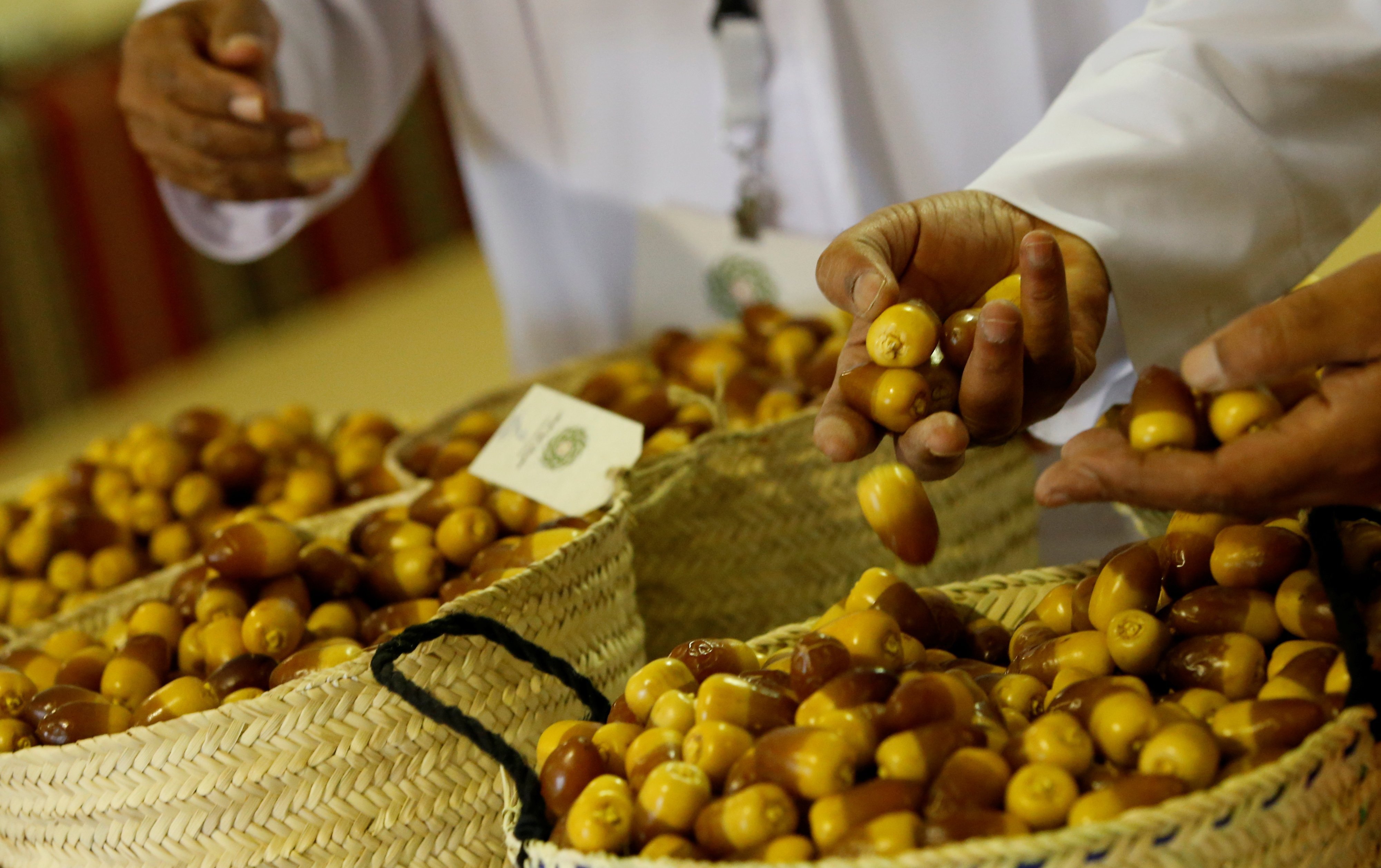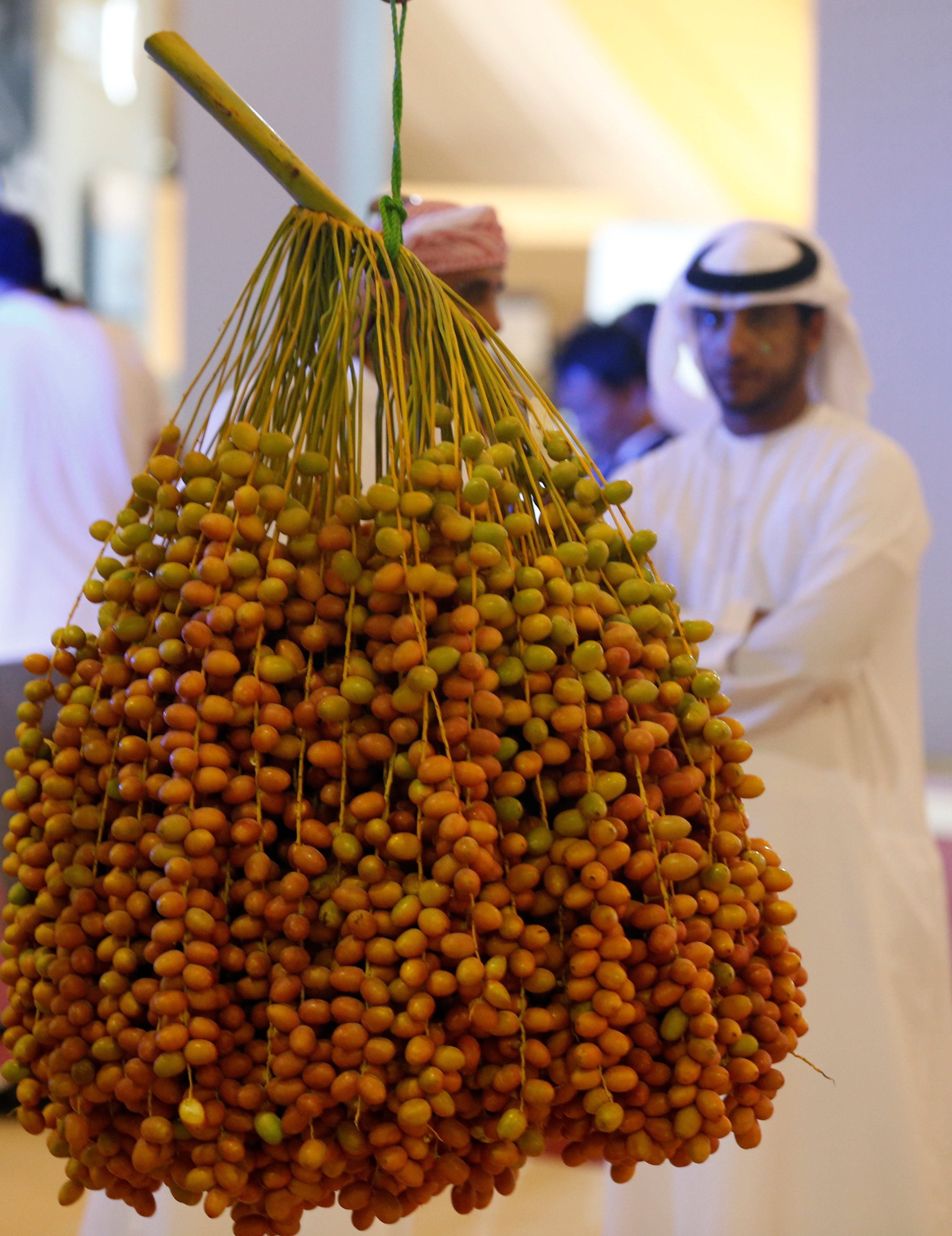 Versenybírók gyümölcsöt mustrálnak a 14. alkalommal rendezett évenkénti datolyafesztiválon az Abu-Dzabitól mintegy 260 kilométerre, délnyugatra fekvő Livában. (MTI/EPA/Ali Haider)Frissen szüretelt gyümölcs. (MTI/EPA/Ali Haider)Frissen szüretelt gyümölcsöt kóstol egy versenybíró. (MTI/EPA/Ali Haider)MTI/EPA/Ali HaiderHagyományos módon, orrhegyük összeérintésével üdvözli egymást két arab férfi a datolyafesztiválon. (MTI/EPA/Ali Haider)Fürtökben lóg a datolyapálma frissen szüretelt gyümölcse. (MTI/EPA/Ali Haider)Kézműves terméket készít egy arab nő a fesztiválon. (MTI/EPA/Ali Haider)