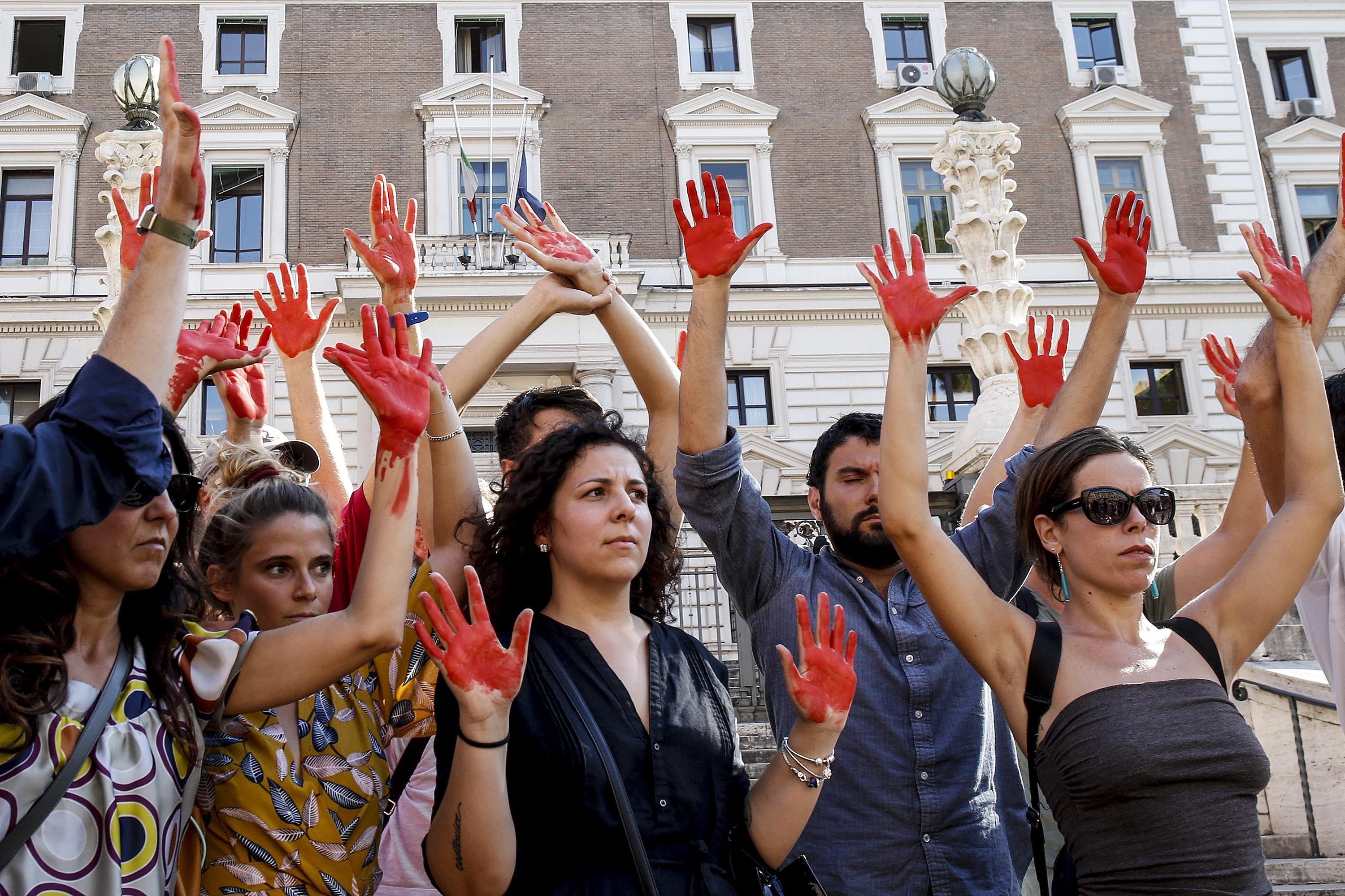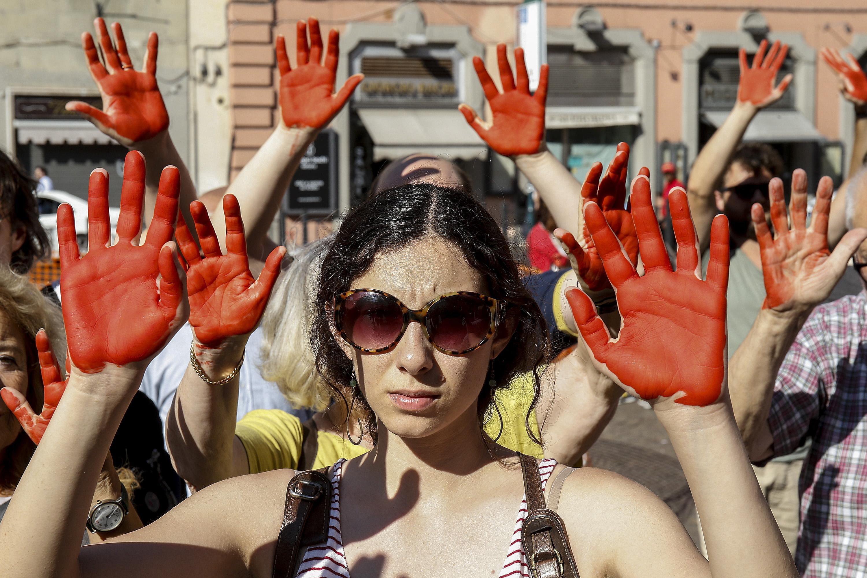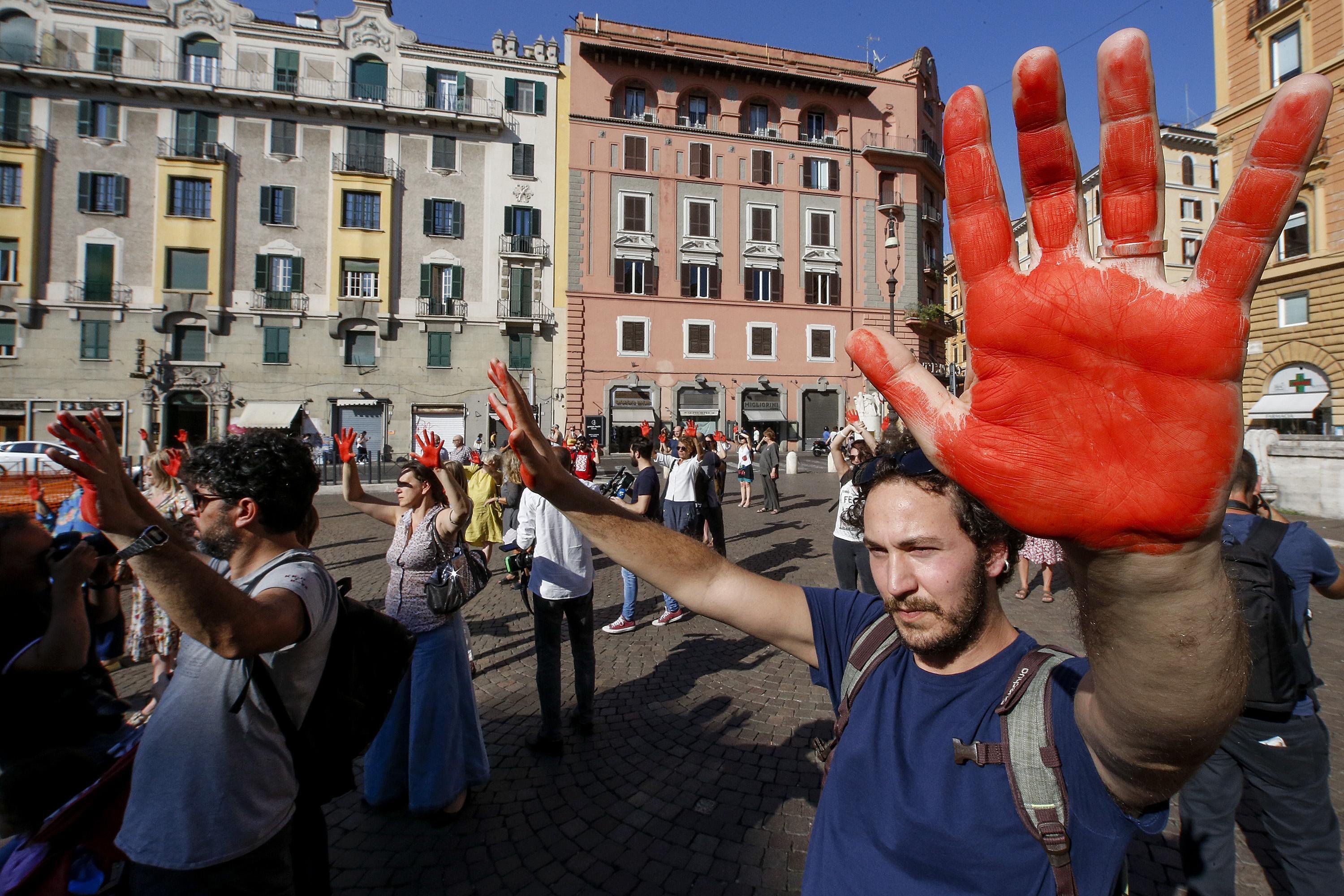Az olasz Radikális Párt (PR) támogatói pirosra festett tenyérrel tüntetnek a Matteo Salvini olasz belügyminiszter által képviselt politikai irányvonal ellen a belügyminisztérium székháza előtt Rómában. (MTI/EPA/Fabio Frustaci)MTI/EPA/Fabio FrustaciMTI/EPA/Fabio Frustaci