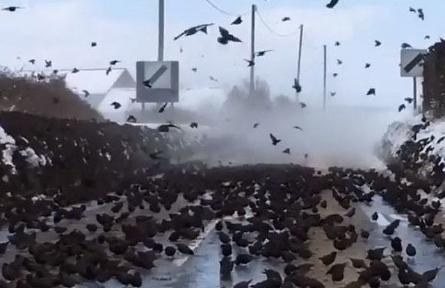 Ugyanígy elborították az utat a brit városban, csak a madarak most nem varjak, hanem seregélyek voltak, de annyian, hogy feketéllett tőlük minden.
