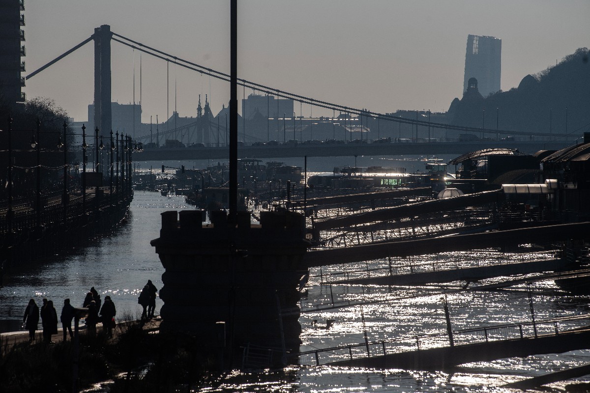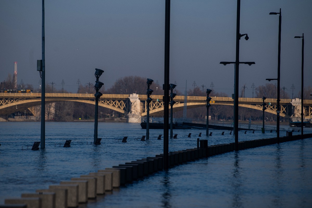 A kiáradt Duna Budapesten, az idősebb Antall József rakparton 2023. december 28-án. Hosszan elnyúló tetőzések, lassú apadás kíséri a dunai árhullámot; Budapesten az előző nap este tetőzött az árhullám, ekkor a legmagasabb vízállás 693 centiméter volt. MTI/Balogh Zoltán