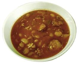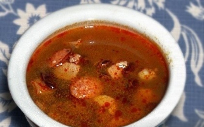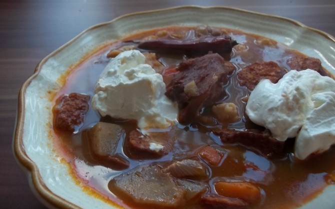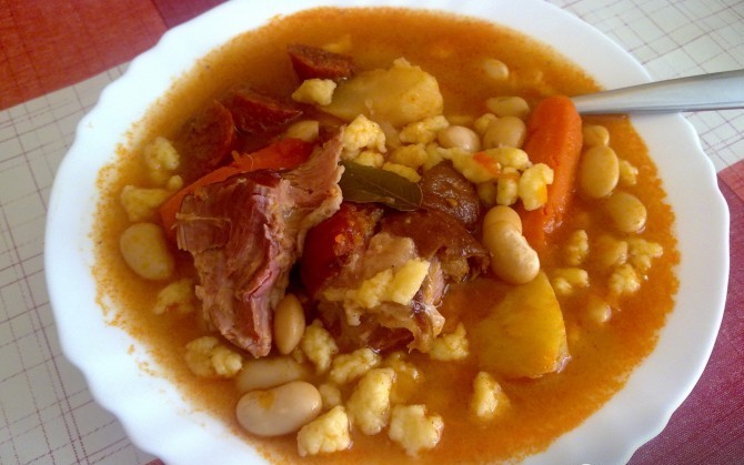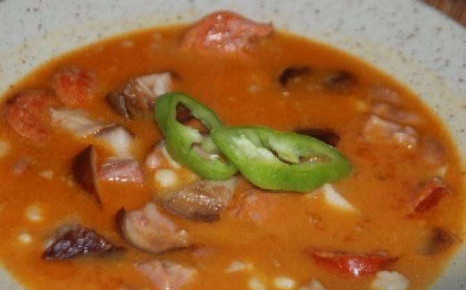 A babot előző nap beáztatjuk. A karajt felkockázzuk, feltesszük főni két és fél liter vízben. Elkészítjük a csipetkét, hagyjuk száradni. Megpucoljuk a zöldségeket, a répákat karikára, a zellert és a krumplit kockára vágjuk, a hagymákat, petrezselymet aprítjuk, 2 db chilit felvágjuk, felkarikázzuk a kolbászt. Másfél óra elteltével hozzáadjuk a babot és a zöldségeket, fűszerezzük. Elkészítjük a rántást. Amikor minden megfőtt, belerakjuk a kolbászt, beleöntjük a vörösbort, beleszaggatjuk a csipetkét, belekeverjük a rántást. A főzés közben elveszett vizet pótoljuk. Tálaláskor merünk a tányérba levest, teszünk rá két kanál tejfölt és egy chilit.