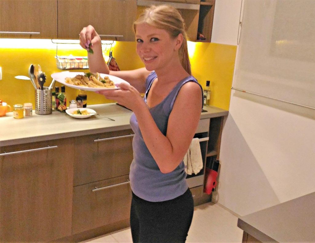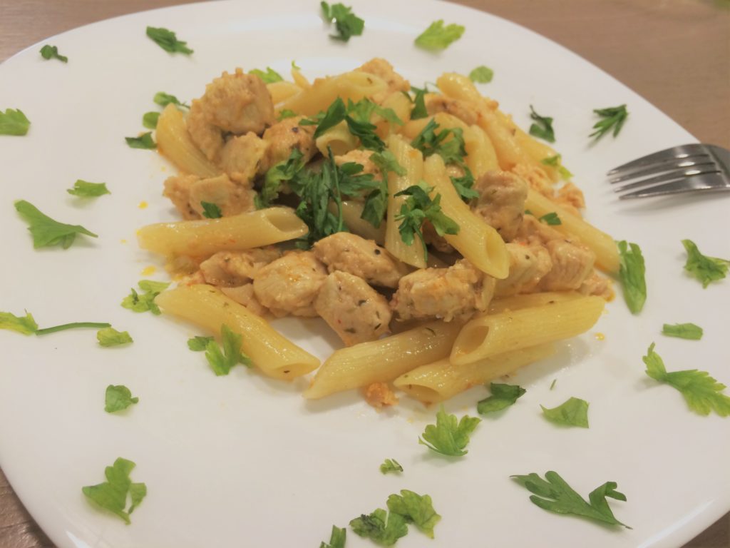 Nyálcsorgatva szemléltem a tökéletes fotókat, és nagy nehezen végre kiválaszottam a pikáns csirkés tésztát (mivel bármilyen száraztésztát lehet választani, esetemben pennéből). Úgy voltam vele: ha egy szimpla, tésztás ételt meg tud bolondítani Enikő úgy, hogy az meggyőz engem, akkor ezek a receptek tényleg jók lesznek.