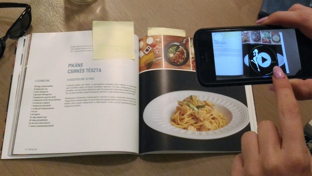 Ha ugyanis leszeded az androidos vagy ios-es telefonodra a teljesen ingyenes Liveprint nevű applikációt, majd elindítod azt, akkor elég csupán a kiválasztott recept fotója fölé tartanod, és az máris betölti a felülnézetből készített videót az elkészítésről. Még zene is van hozzá, nagyon buli! Ahogy néztem a videón piruló csirkekockákat, csak arra tudtam gondolni: a receptkönyvek is elindultak a jövő technológiájának útján, és ez itt a kezemben a magyarországi úttörő.