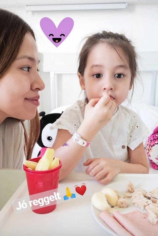 Szilvi a tegnapi operációt követően tette közzé az alábbi fotót, amin Szofi épp eszik, és szemmel láthatóan nagyon jól viselte a megpróbáltatásokat.