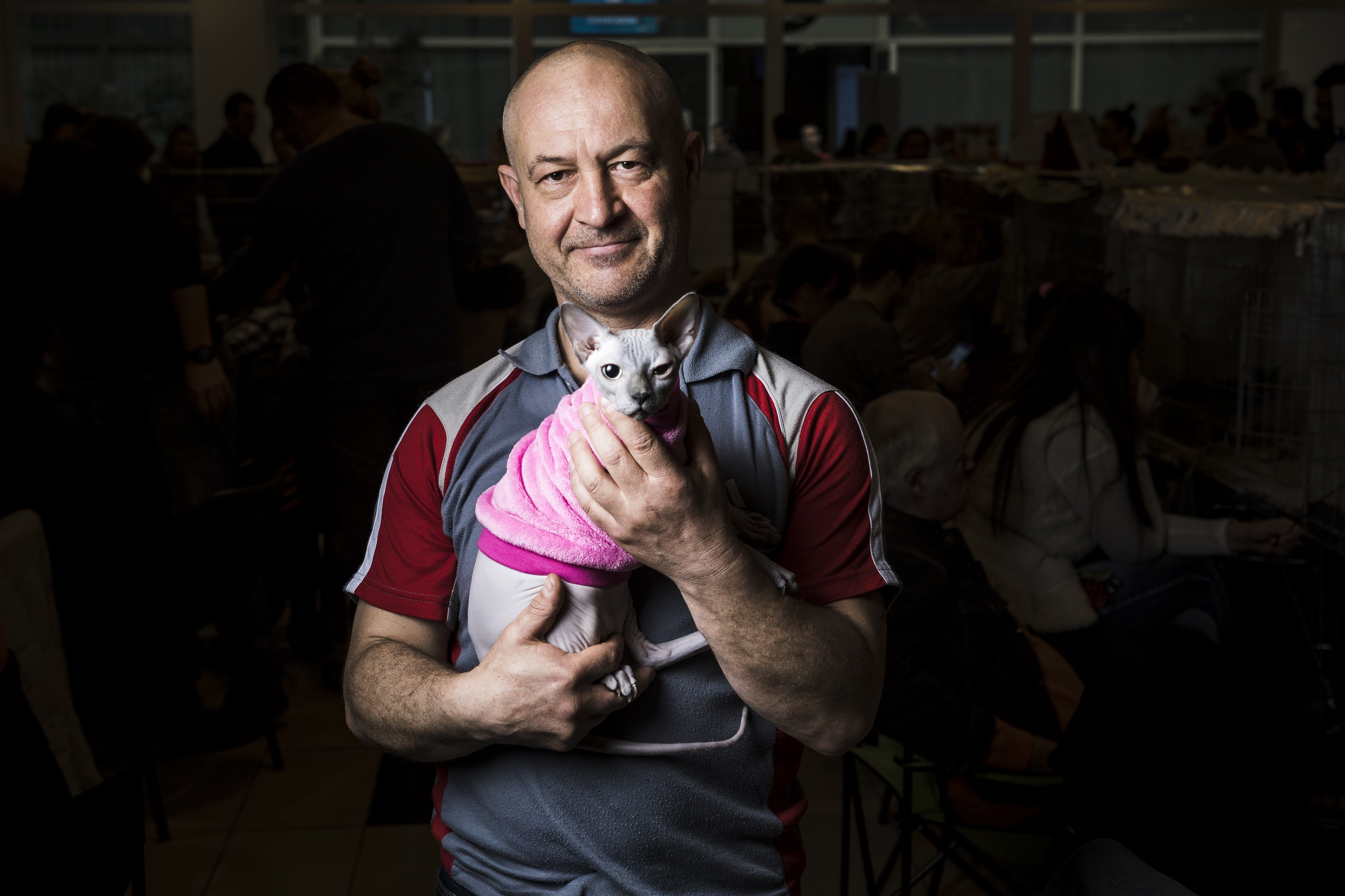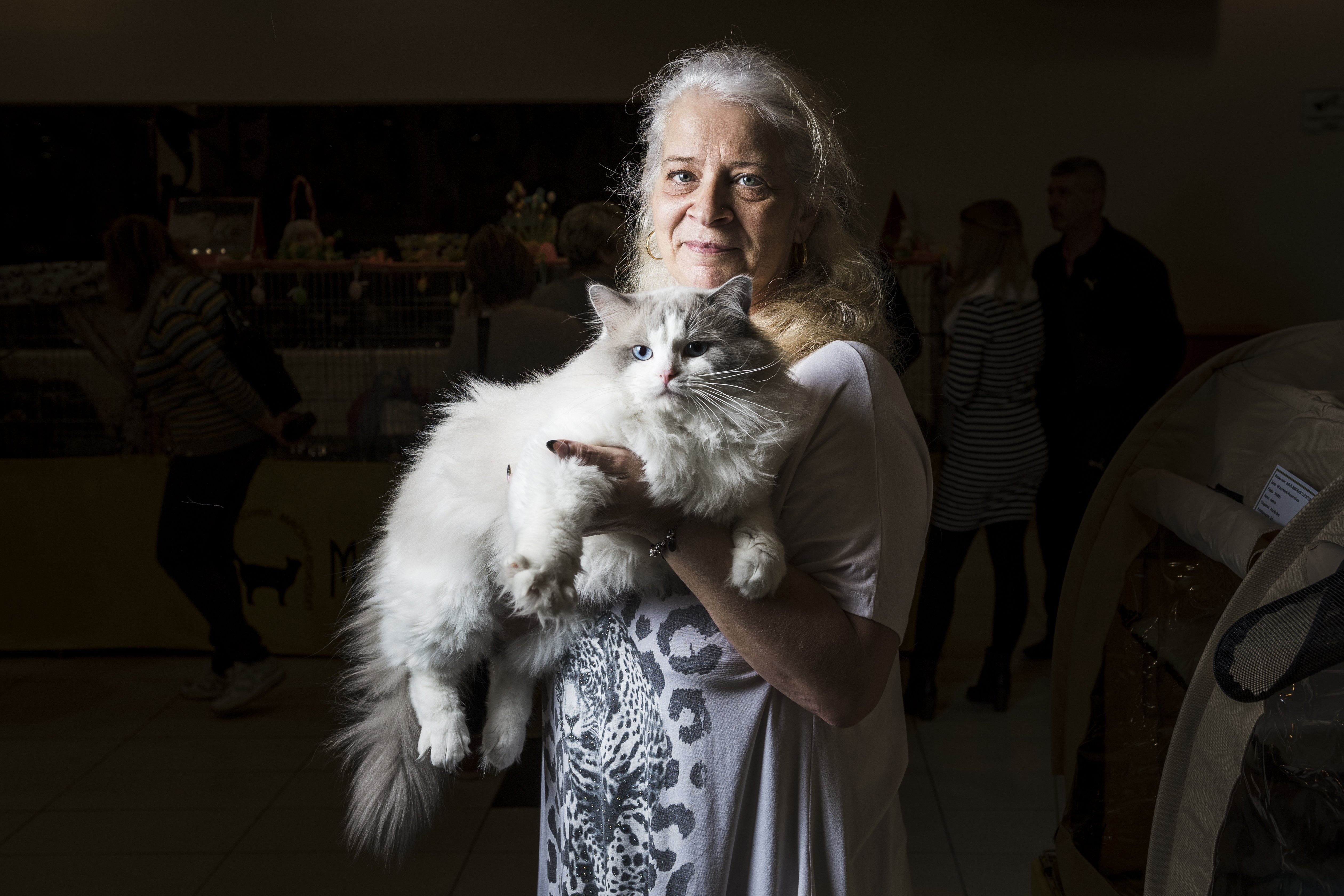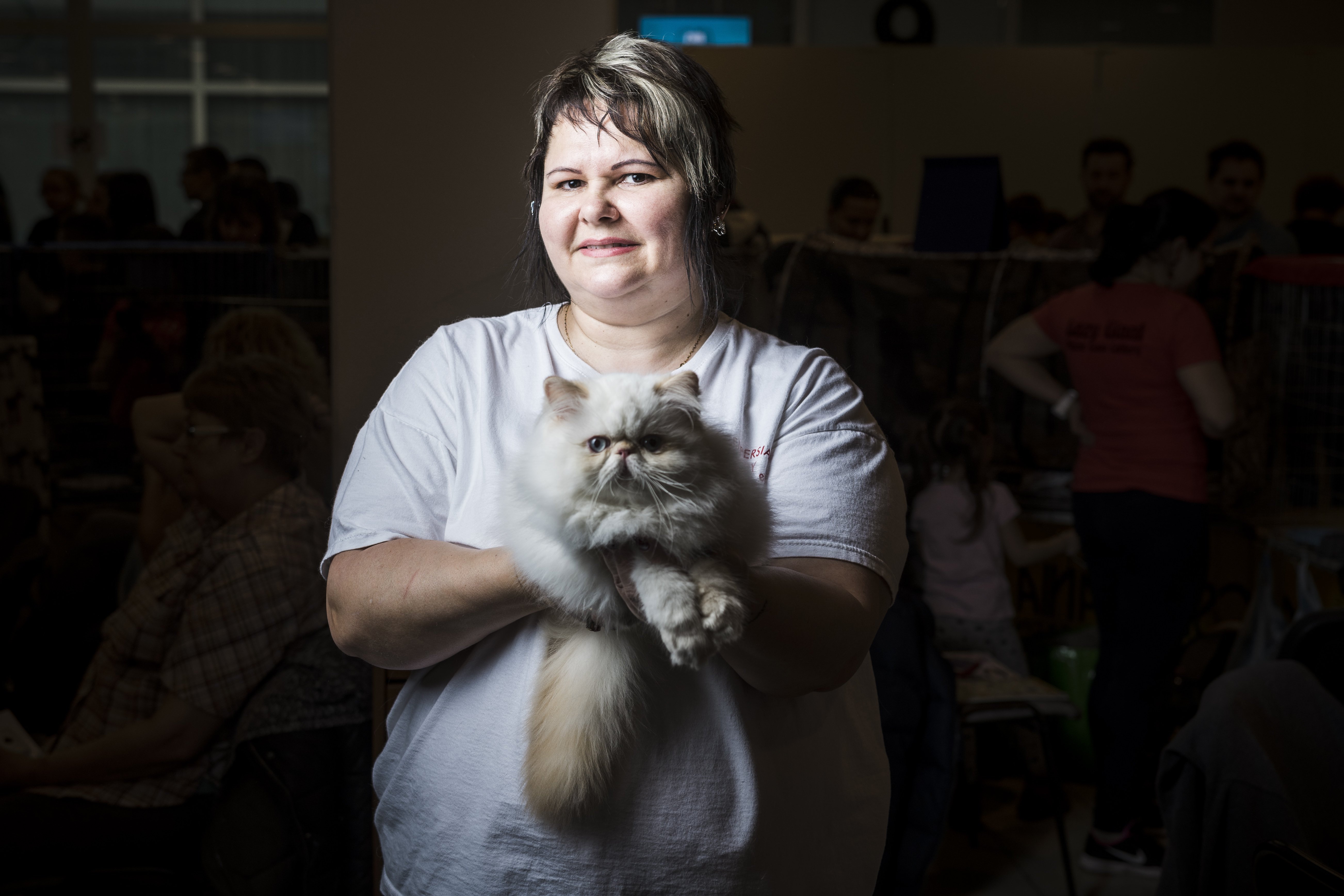 Egy kiállító ragdoll fajtájú macskájával a fõvárosi Lurdy-házban megrendezett nemzetközi macskakiállításon 2018. március 17-én. (MTI Fotó: Mónus Márton)