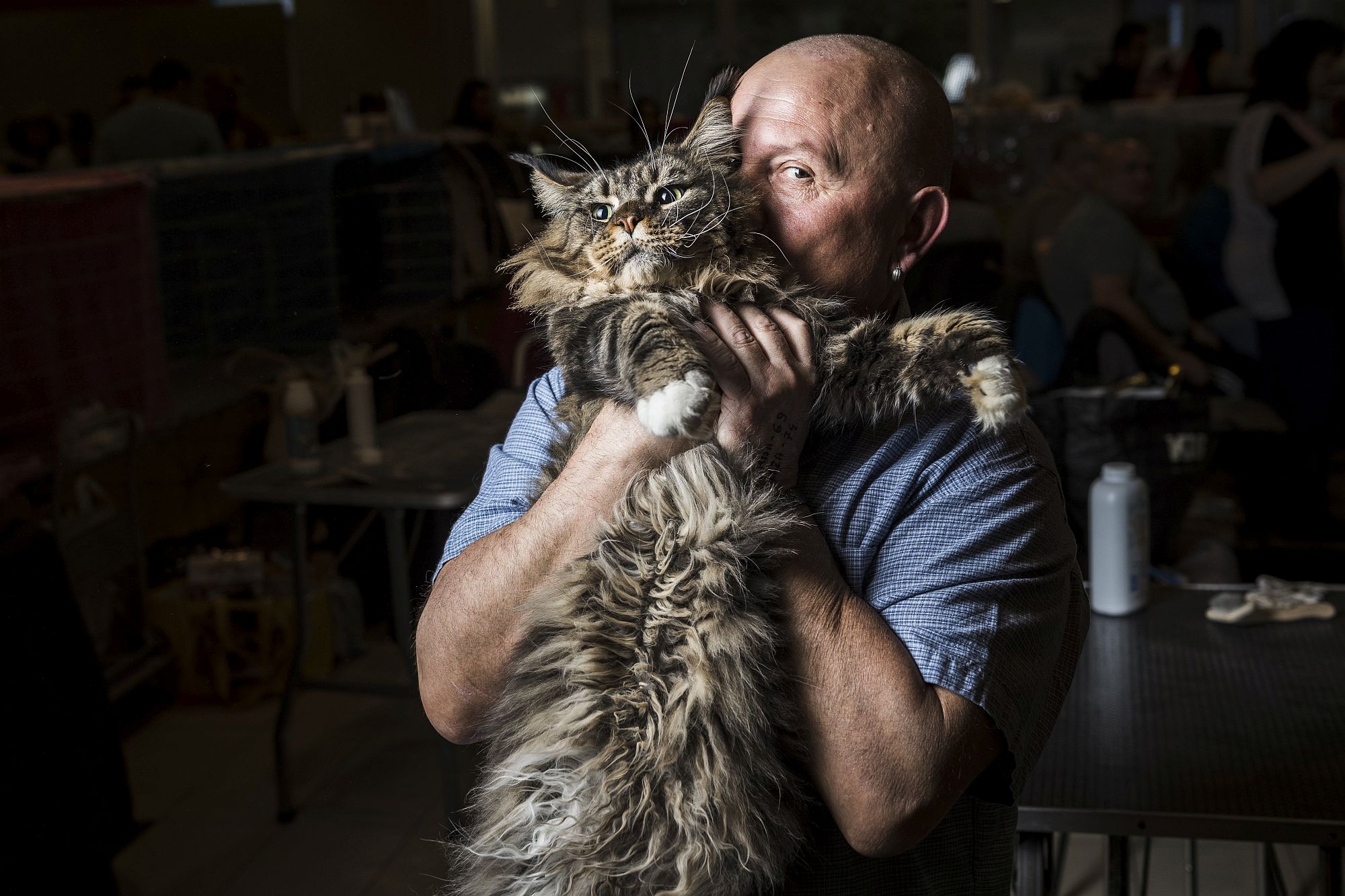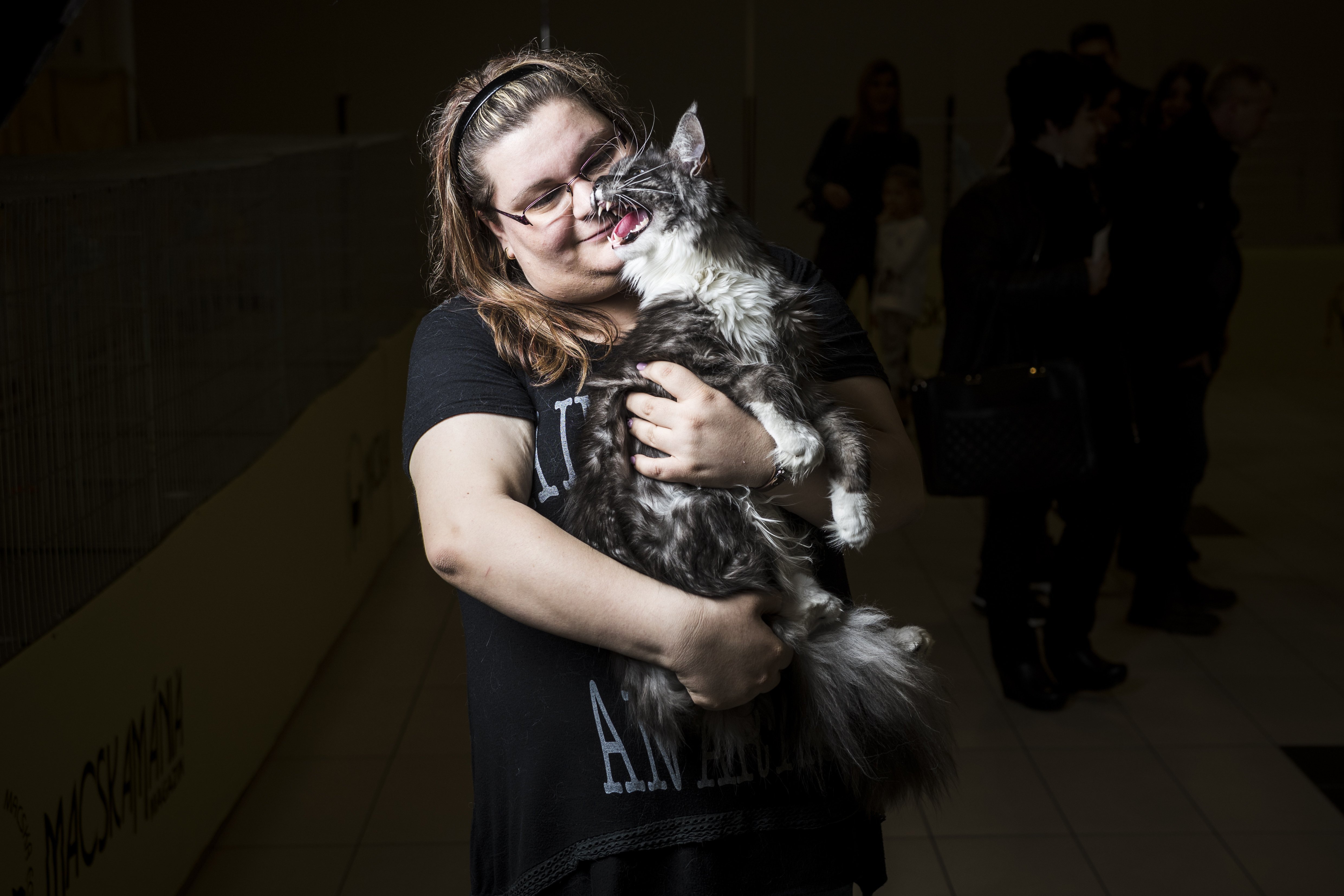 Egy kiállító maine coon fajtájú macskájával a fõvárosi Lurdy-házban megrendezett nemzetközi macskakiállításon 2018. március 17-én. (MTI Fotó: Mónus Márton)