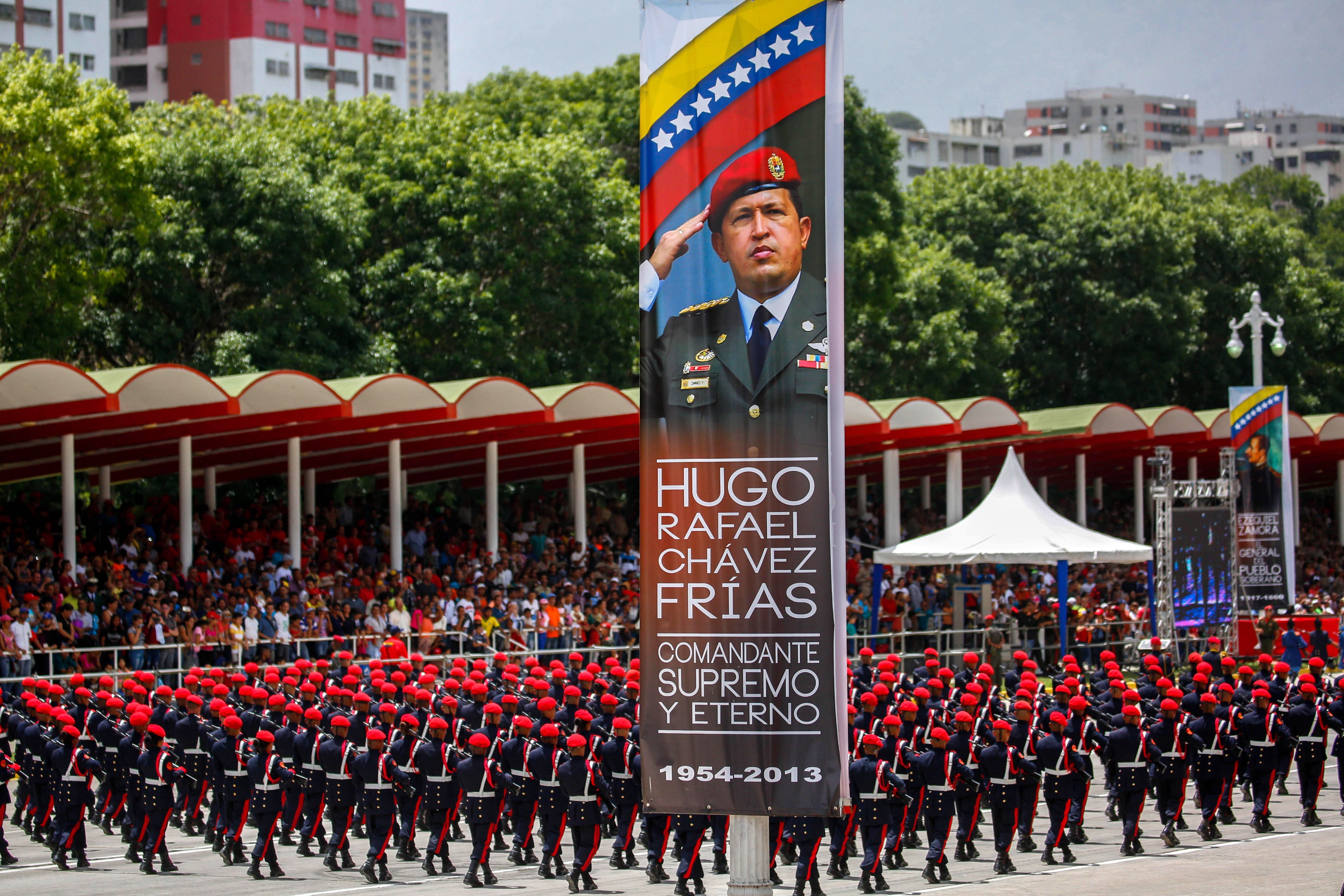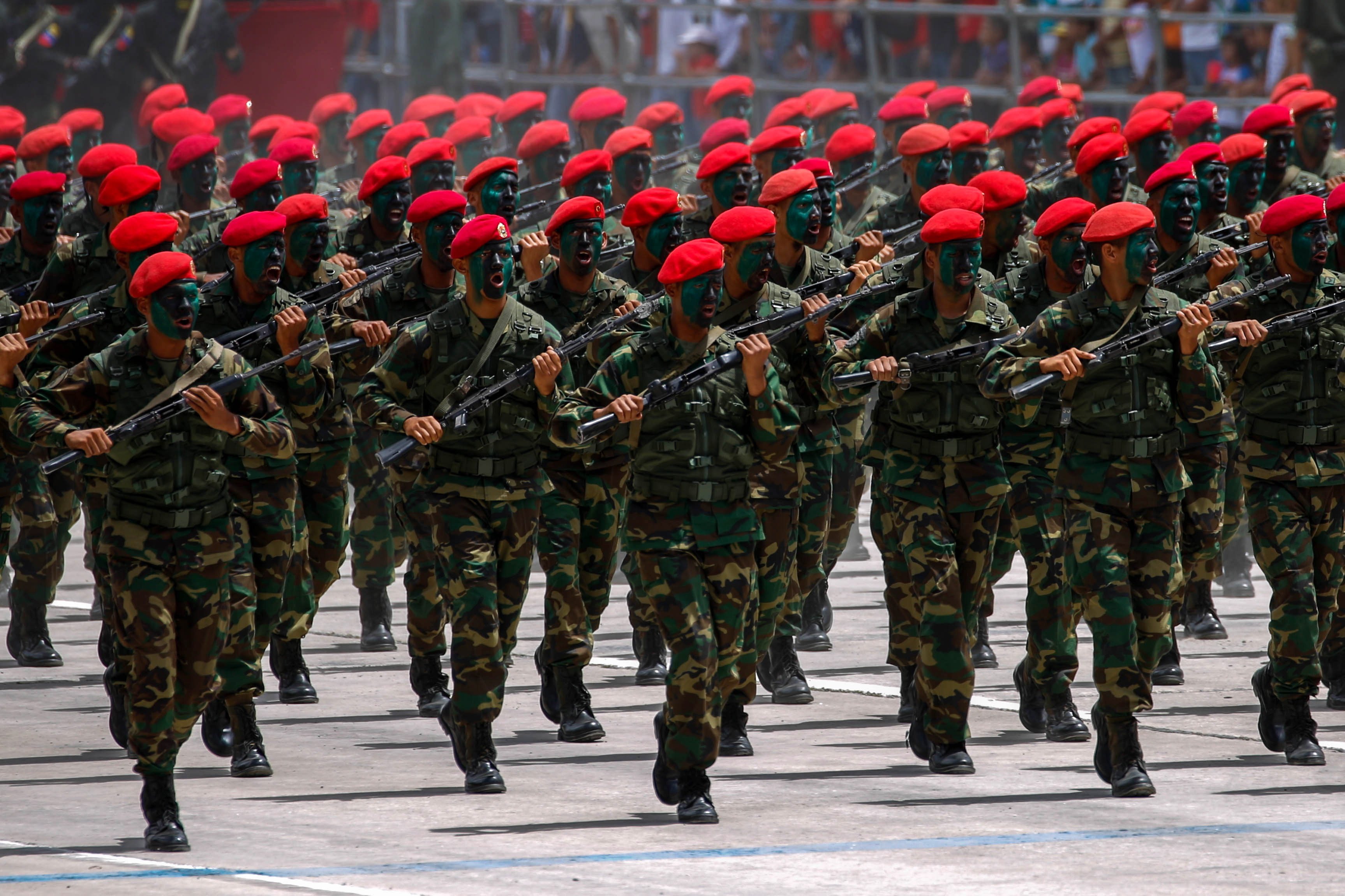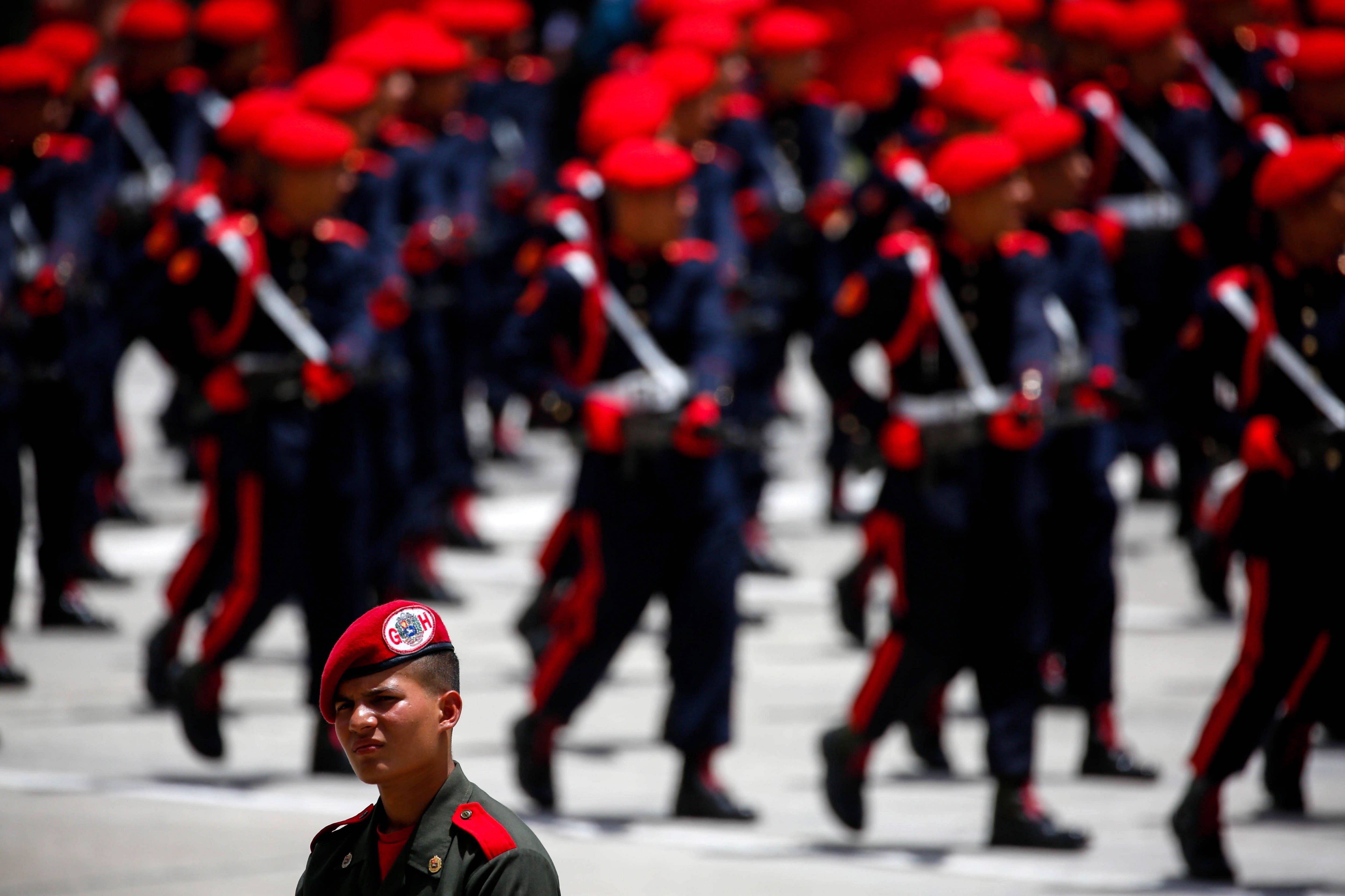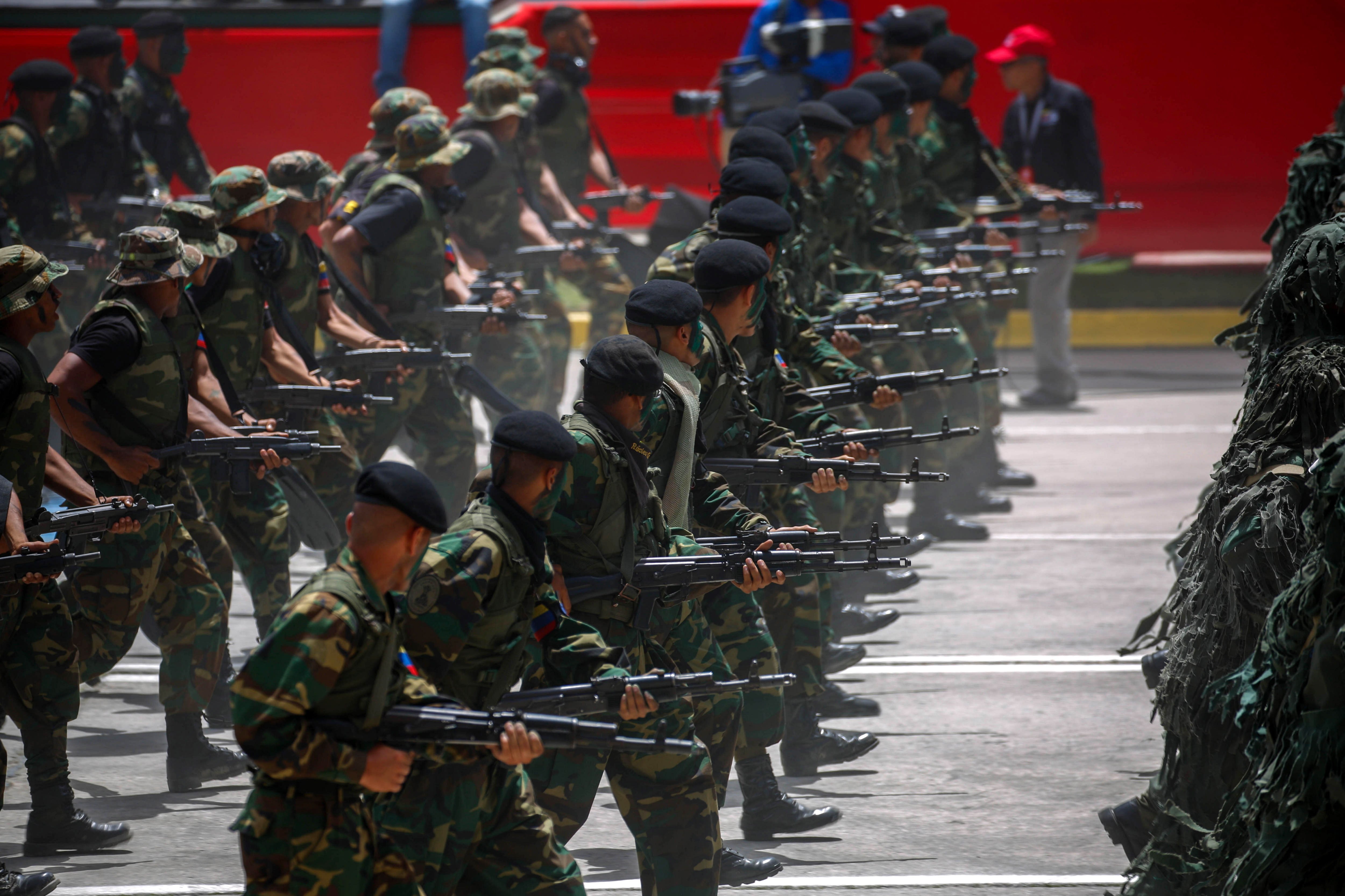 Venezuelai katonák menetelnek az ország függetlenségének 207. évfordulója alkalmából tartott díszszemlén, Caracasban 2018. július 5-én. Venezuela 1811-ben ezen a napon kiáltotta ki függetlenségét a Spanyol Birodalomtól, önrendelkezését végül a latin-amerikai függetlenségi háborúk után (1810–1825) nyerte el.
