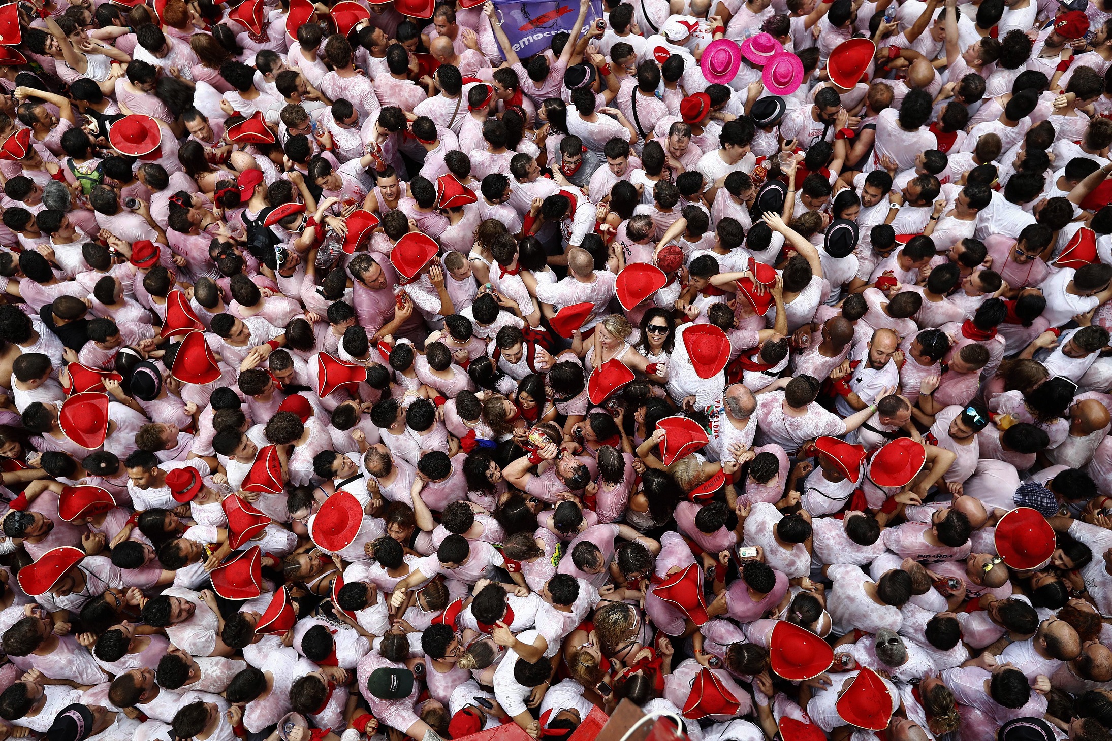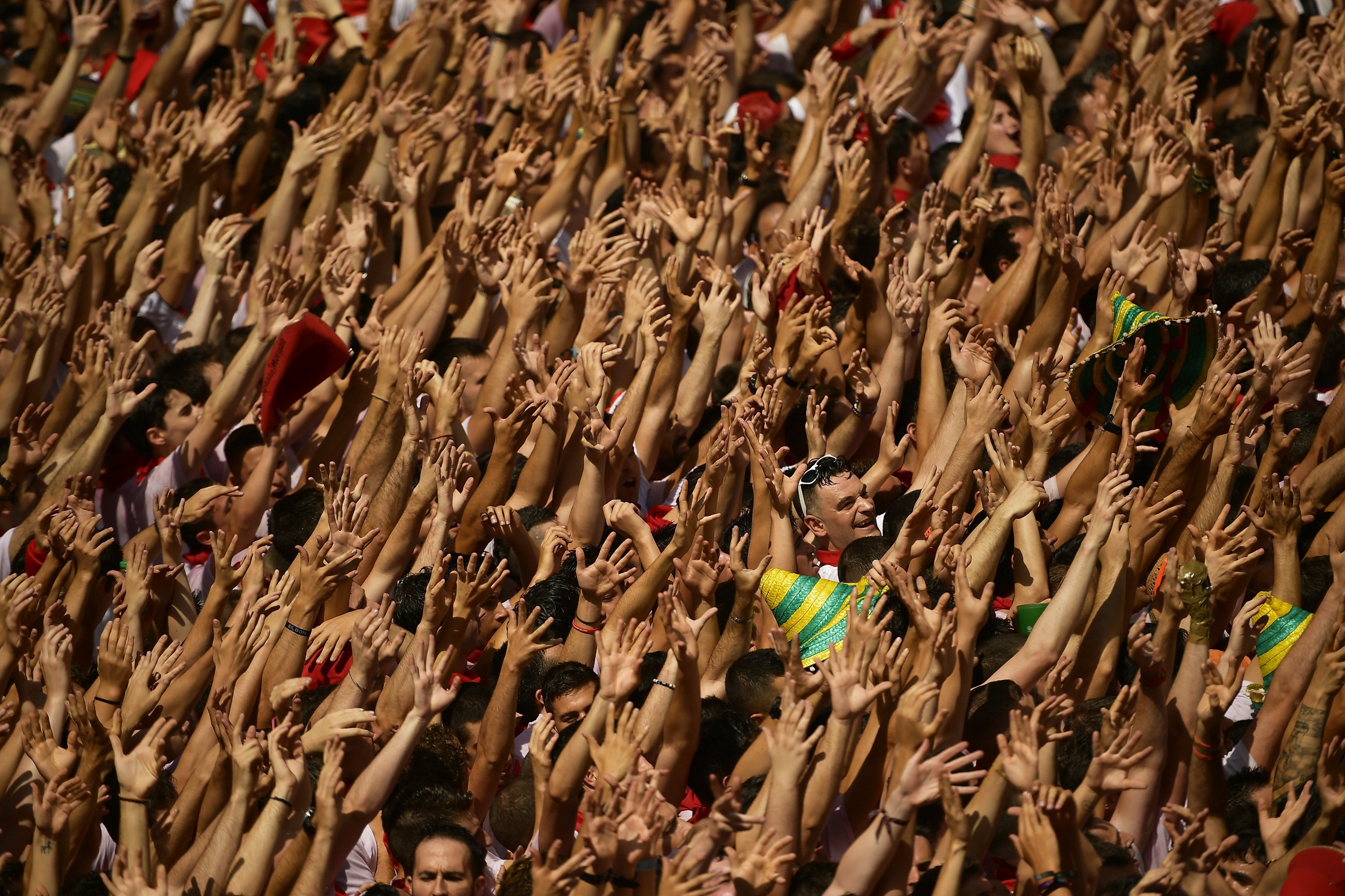 A spanyol város védőszentjének tiszteletére 1591 óta évente megrendezett kilencnapos fiesta egyik fő attrakciója a reggelenkénti bikafuttatás, amelynek során férfiak százai teszik próbára bátorságukat azzal, hogy az arénába hajtott állatok előtt végigszaladnak Pamplona utcáin. (MTI/EPA/Daniel Fernández)
