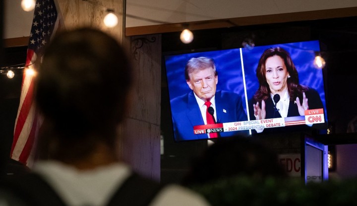 Címlapkép: Egy járókelő nézi egy tévé képernyőjén Donald Trump és Kamala Harris televíziós vitáját (Fotó: AFP)