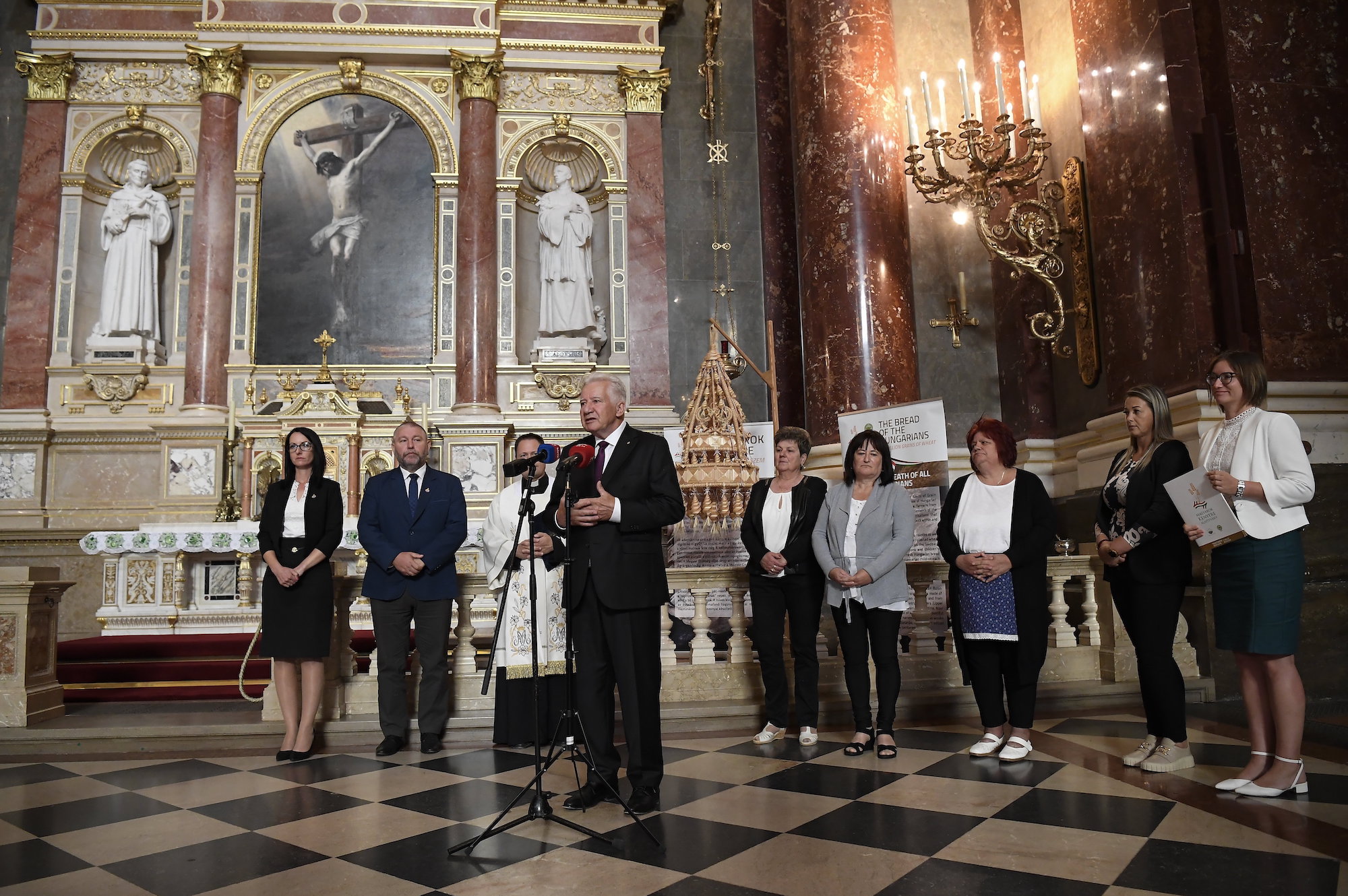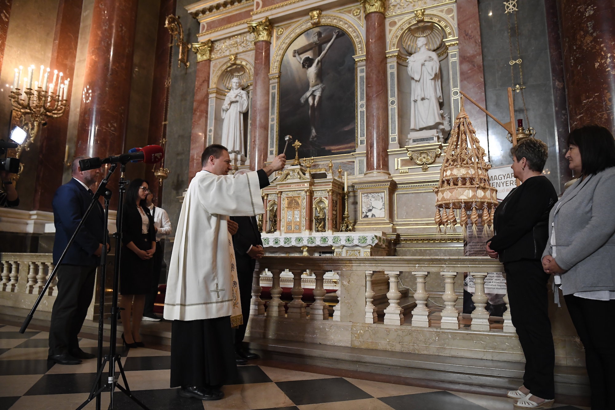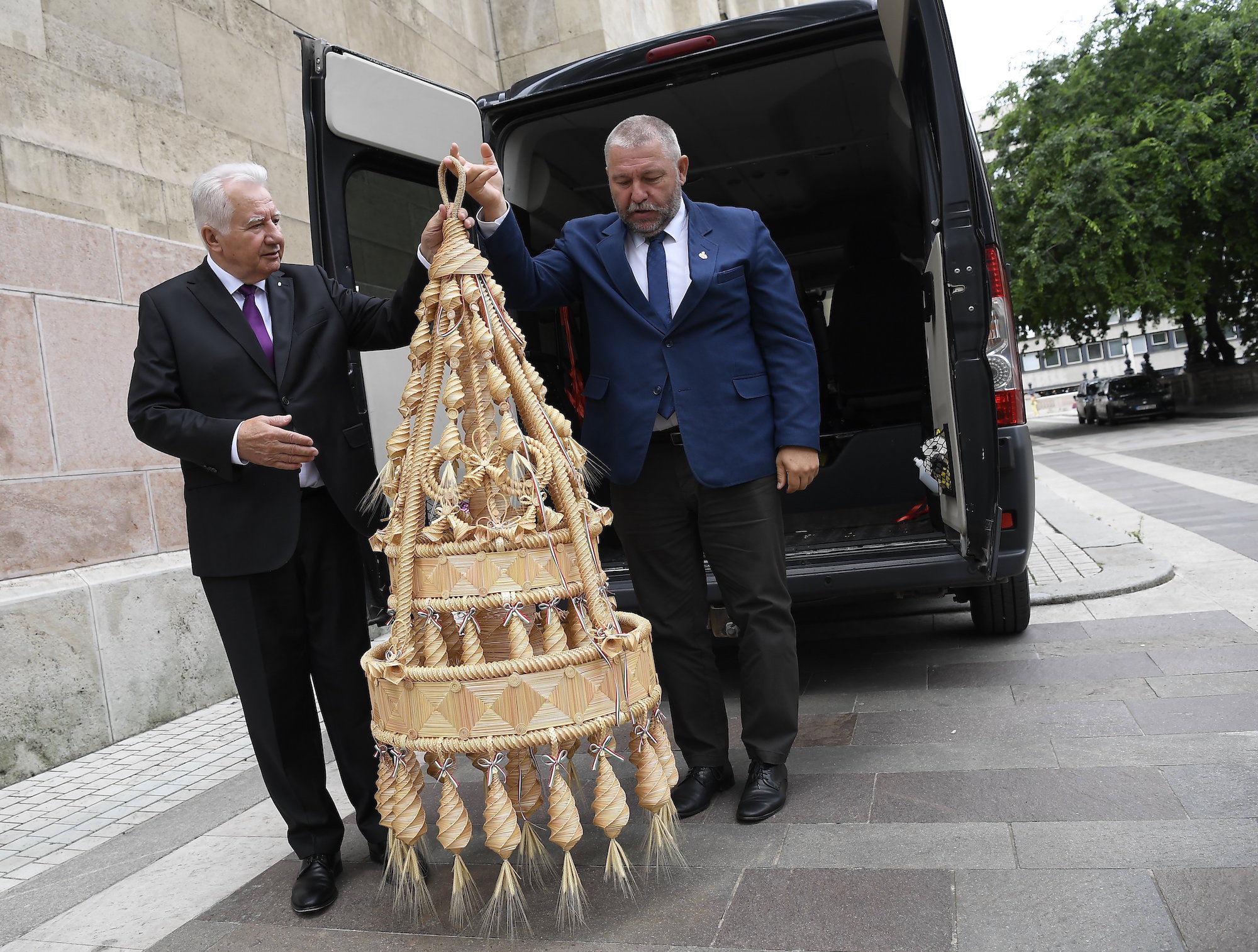 – fogalmazott Jakab István. Az aratókoszorút a Szent István Bazilika újonnan kinevezett plébánoshelyettese, Kovács Zoltán atya vette át, aki imádságban kérte a Jóisten áldását a gazdákra, malmokra, pékekre és az asszonyokra, majd a könyörgést követően áldást mondott az aratókoszorúra, amely október végéig tekinthető meg a Bazilika szentélyében, és az augusztus 20-i Szent Jobb Körmenetben is.