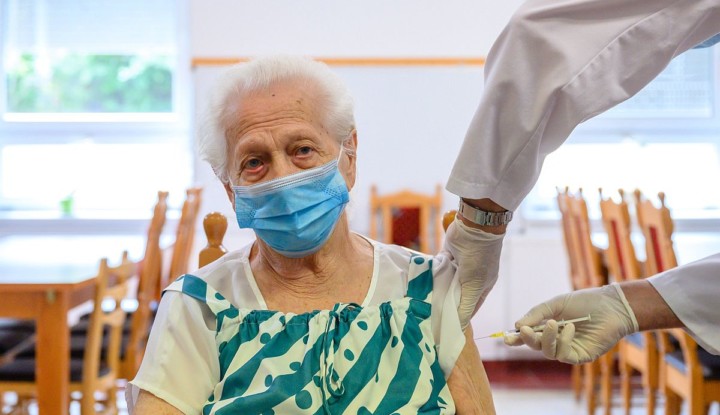 Egy nő megkapja a német-amerikai fejlesztésű Pfizer-BioNTech koronavírus elleni oltóanyag, a Comirnaty-vakcina harmadik, emlékeztető adagját a veszprémi Támasz Idősek Otthonában 2021. augusztus 2-án. (MTI/Vasvári Tamás)