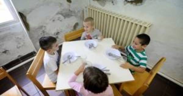 Itt egy friss kép egy hazai menzáról: salétromos falak, málló vakolat, ebédre készülő gyerekek.
