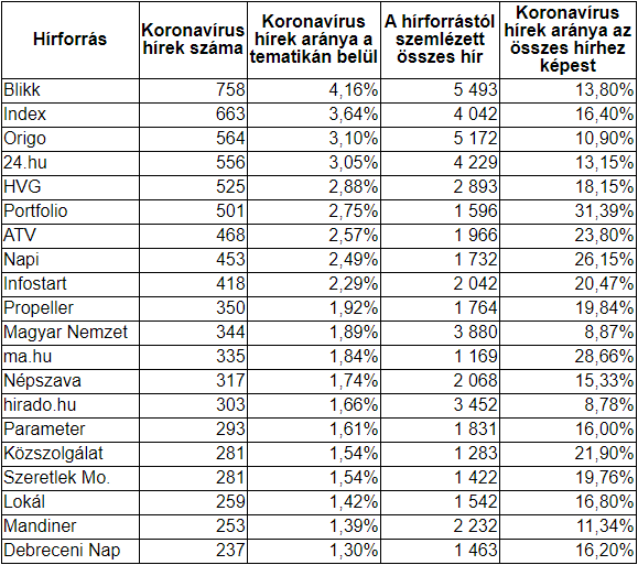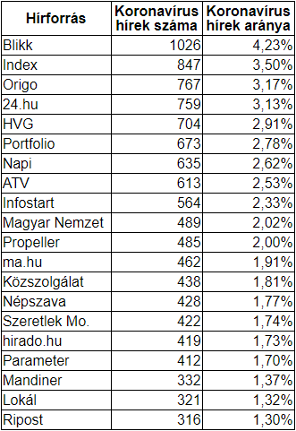 Az alábbi táblázat tovább részletezi az előbbi grafikonokat, így megértésük könnyebb lehet. A 30 napos csúcsidőszakot vizsgálva a Blikk teljes gyártásának majd 14%-át, azaz 758 hírt, az Index 16%-át azaz 663 hírt, míg az Origo 564 hírrel majd 11%-ot, és a 24.hu 556 hírrel 13,15%-ot csoportosított a hírgyártásából a koronavírus témakörére.