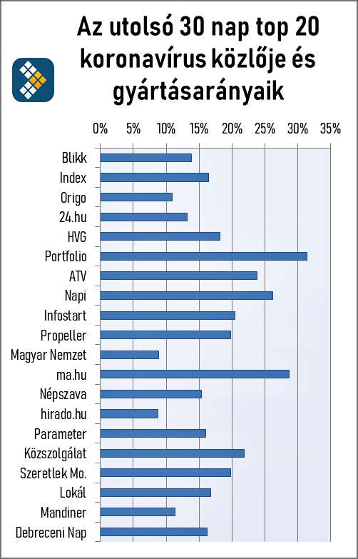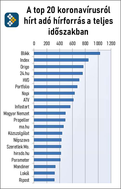 A hírportálok tekintetében felállítható egy rangsor aszerint, hogy milyen eloszlásban készültek a koronavírus témakörben születő hírek. A vizsgált időszakban született cikkek mennyiségét mutatja az alábbi első oszlopgrafikon. A legtöbb tartalmat a Blikk gyártotta, 4,23%-ban uralja a koronavírus tematikát több mint 1 000 linkkel. Ezt követi az Index 847 anyaggal, majd az Origo 767, és a 24.hu 759 anyaggal.