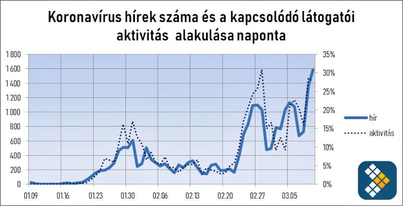 Március 9-én, hétfőn 1 364 hírre, majd 10-én keddre már 1 588 hírre mutató linket szemlézett a koronavírus témakörben a Hírstart rendszere, mely a látogatói aktivitás 28-29%-át vitte el annak ellenére, hogy a korábbiakhoz képest 50%-kal növekedett a hírek mennyisége.