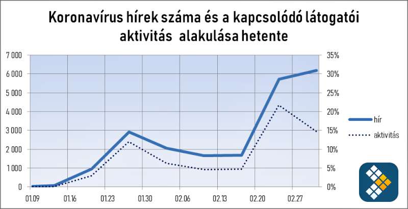 Február utolsó hetében több mint 5 700 hírt címkézett fel koronavírus témakörben a Hírstart, majd március elejére már 6 100 hír született. Azonban, amíg a látogatói aktivitás a témában együtt növekedett a hírek mennyiségével, az érdeklődés csökkenni látszott, 22%-ról 15%-ra esett vissza. A látogatói aktivitás szinte egyenesen arányos a teljes aktivitással, azaz február utolsó hetében ennek negyedét uralta a koronavírus témaköre.