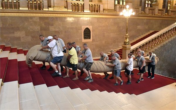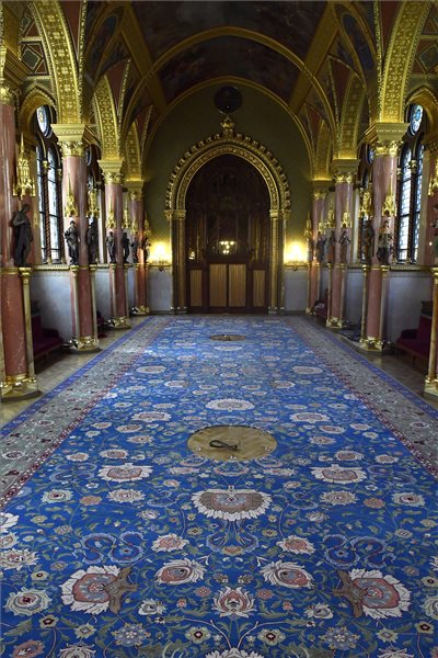 Elkészült és a helyére tették az Országház Kék társalgójának szőnyegét csütörtökön.