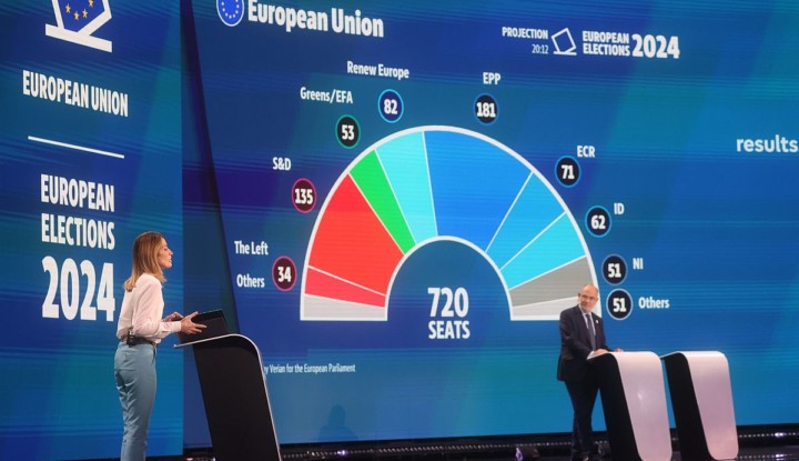 Címlapkép: Roberta Metsola, az Európai Parlament elnöke (b) az előzetes eredmények alapján készített mandátumbecslés grafikonját mutatja be Brüsszelben az európai parlamenti választások estéjén, 2024. június 9-én. (Fotó: MTI/EPA/Olivier Hoslet)