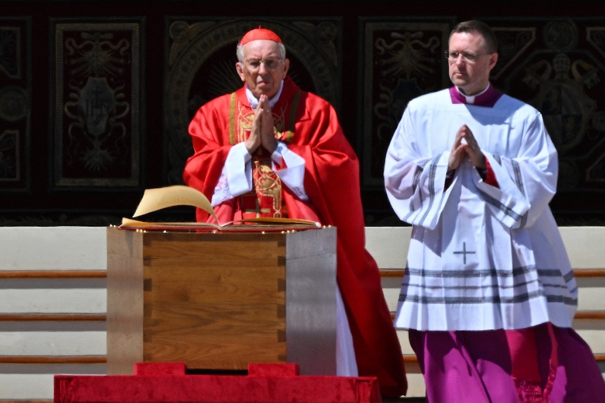 Ferenc pápa búcsúztatására április 26-án került sor a vatikáni Szent Péter téren, ahol a szertartás tíz órakor kezdődött és szerény körülmények között zajlott, Őszentsége kívánsága szerint. A pápát végül a Santa Maria Maggiore-bazilikában helyezték végső nyugalomra, az „utolsók”, vagyis szegények és hajléktalanok jelenlétében is. A búcsúztatás publikus része után a temetés záró szakasza már nem volt nyilvános. Forrás: 24.hu / Fotó: AFP