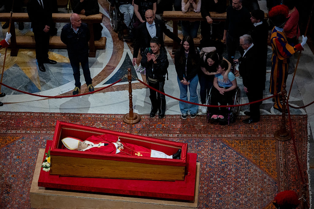 Ferenc pápát saját kérésének megfelelően használt ruhadarabokban helyezték el a koporsójában, köztük azzal a fekete, kitaposott cipővel, amelyben végigjárta a világot. A koporsó szintént az egyszerűséget jelképezte, hiszen fából készült, mindenfajta hivalkodás nélkül. A felravatalozás során is kerülték a pompát, Őszentsége kérésének megfelelően. Forrás: MTI / Fotó: Getty Images