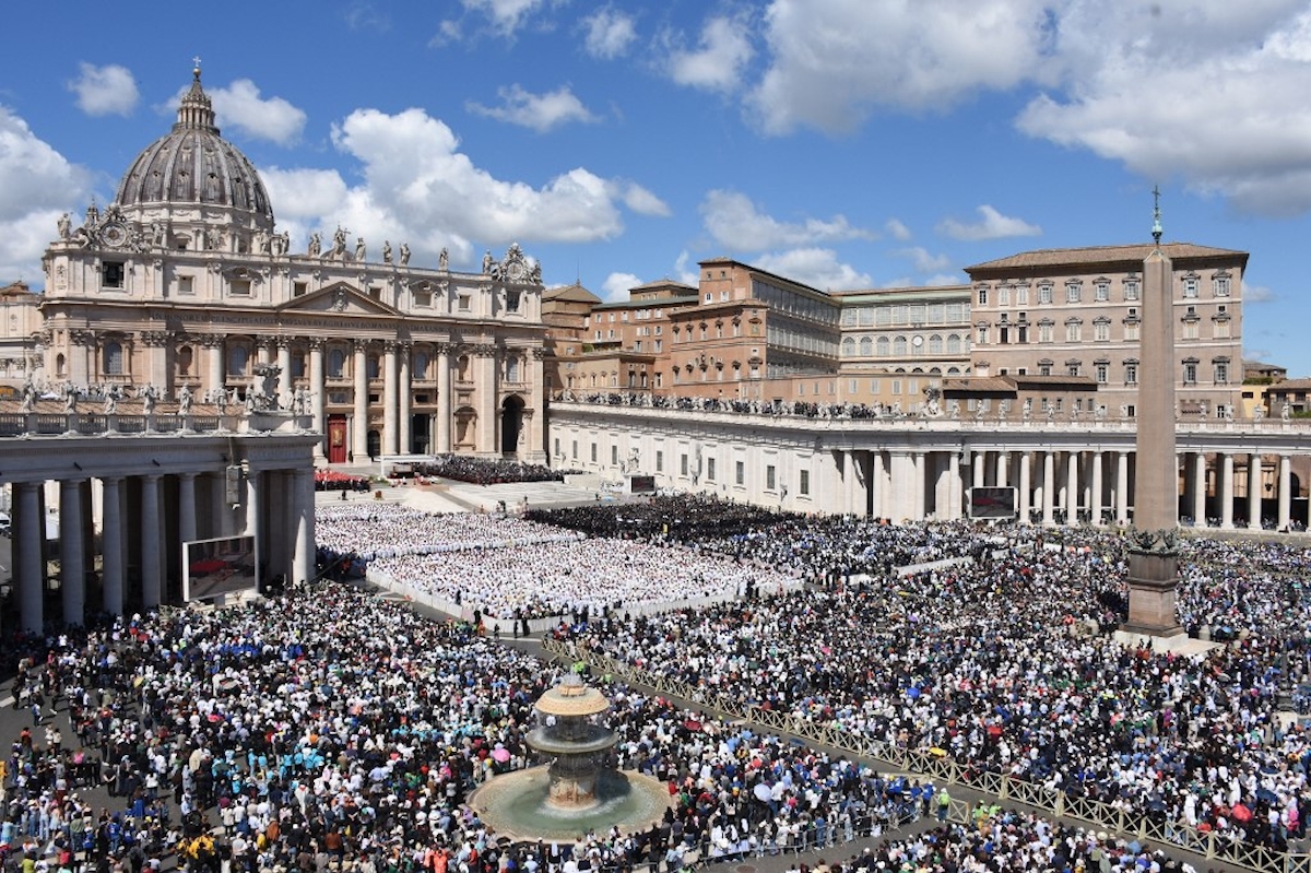 A Ferenc pápa búcsúztatásán a vatikáni hatóságok a szertartás kezdetén még 140 ezer résztvevőt becsültek, de a szertartás alatt folyamatosan érkeztek további gyászolók, így végül több mint 250 ezren gyűltek össze a Szent Péter téren és környékén; emellett Róma-szerte kivetítőkön is követték a hívek az eseményeket. Forrás: MTI / Fotó: Getty Images