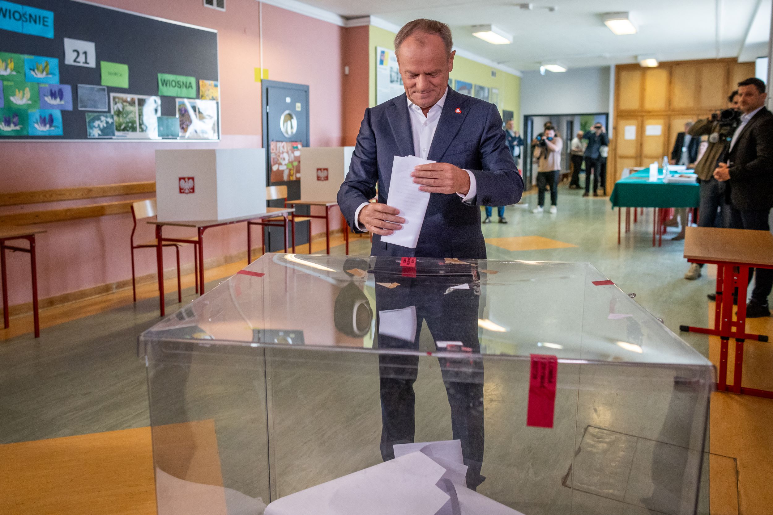 Donald Tusk lengyel miniszterelnök leadja szavazatát az európai parlamenti választásokon Varsóban 2024. június 9-én. Fotó: AFP
