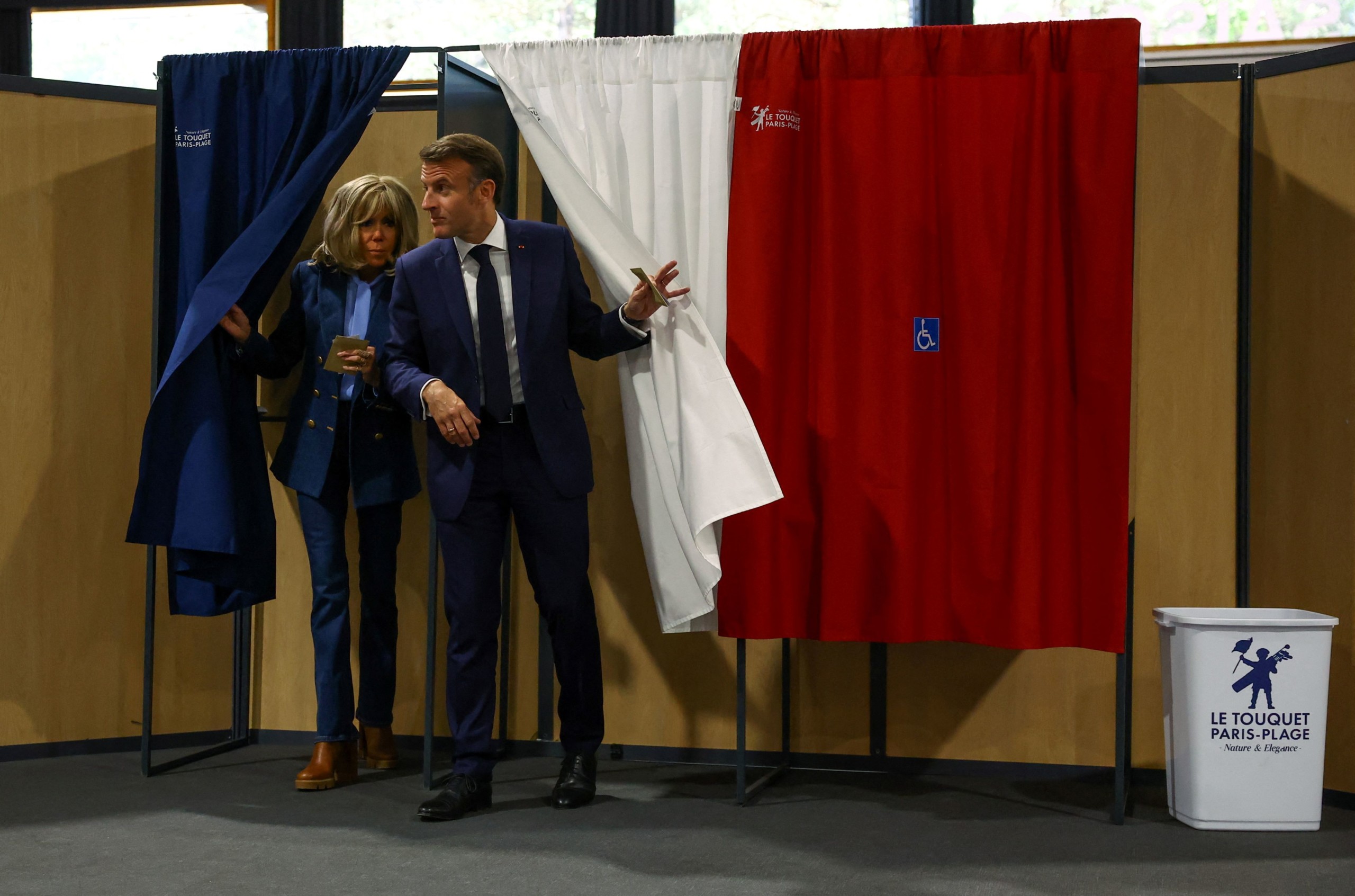 Emmanuel Macron francia elnök és felesége, Brigitte Macron kilép a szavazófülkéből az európai parlamenti választásokon Le Touquet-Paris-Plage településen 2024. június 9-én. Fotó: MTI/EPA/Reuters pool/Hannah McKay